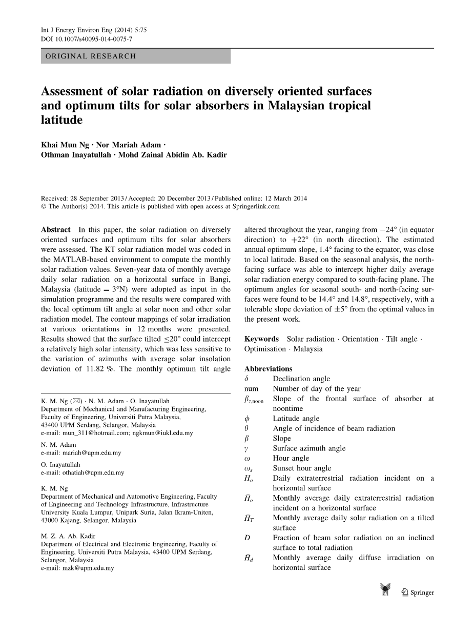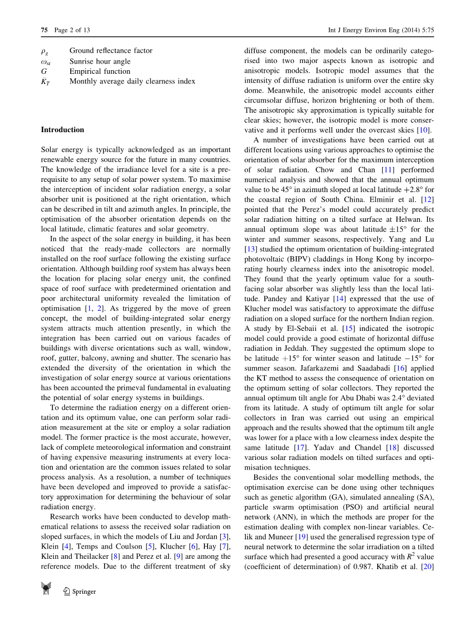 许多研究人员已经在国家中研究了太阳辐射,简而言之,以前的工作使用各种技术进行分析并测量太阳强度和太阳行为,而不考虑具体的定向因素。尽管有吸引力,赤道热带在不同方位角和倾角处的太阳强度的调查研究很少。大多数研究报道,在中纬度地区,可能不适用于以低纬度地区为特征的低纬度地区变异。在马来西亚,一些文章对定向方面感兴趣。 估计太阳能收集器在某些操作时期的最佳坡度,为季节性太阳能应用提出最佳坡度。在建筑中的太阳能方面,已经注意到现成的收集器通常安装在屋顶表面上,遵循现有的表面取向。 虽然建筑屋顶系统总是位于太阳能单元的位置,屋顶表面与预定方向和较差的建筑均匀性的限制空间揭示了优化的局限性。 由于绿色理念,建筑集成太阳能系统的模型目前吸引了很多关注,其中集成已经在具有不同取向的建筑物的各种外墙上进行,诸如墙壁,窗户,屋顶,沟槽,阳台,遮阳篷和快门 。 该方案扩展了方向的多样性,其中在各种方向的太阳能源的研究已经被认为是评估建筑物中太阳能系统的潜力的主要基础。另一项研究[是处理热水系统的最佳斜率。在其他低纬度地区,Yakup和Malik 估计了文莱太阳能收集器的最佳定向。他们建议每年改变最佳倾斜角12次,其中输出与每天改变的最佳倾斜角定量比较。 评估了巴西建筑物在0和30S之间纬度的光伏应用的各种表面上接收的太阳辐射强度。他们指出,最佳值可以高于9。为尼日利亚的太阳能加热系统的性能提升提出每月优化的倾斜角。建议的倾角范围在plusmn;25°之间。在“经验法则”中,南向表面为位于北半球的地区提供了太阳辐射能量收集,反之亦然。这在中高纬度地区是正确的,其中太阳倾向于南部或北部的天空更长的一段时间期。 然而,在低纬度地区,情况是不相同的。 太阳倾斜到南方和北方天空的场地在一年内有更均匀的时期。因此,对于低纬度,尽管其位置在北半球,北方向的表面可以可能拦截显着量的太阳辐照度。它导致一个合理的假设,北向组件可以接收合理的辐射量能源。 预期最佳倾斜角度被定位面向北方为季节性最佳能量收集。