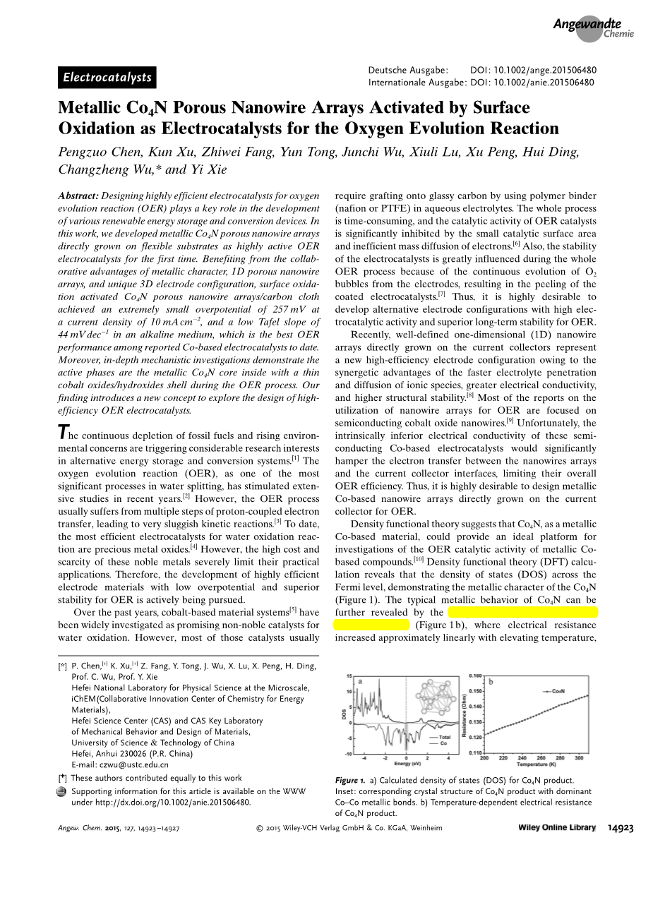 通过表面氧化的活性金属Co4N多孔纳米线阵列作为氧气产生反应的电催化剂