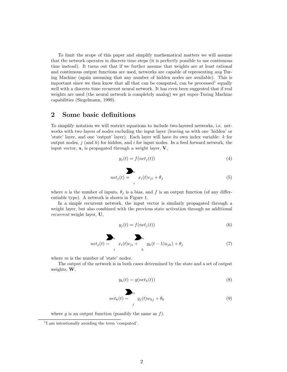 为了限制这篇文章的范围并简化数学问题,我们可以假设神经网络以离散的时间步长运行(完全可以使用连续时间)。正如事实证明的那样,如果我们进一步假设权重至少是合理的,并且使用连续的输出函数,则神经网络能够表示任何图灵机器(再次假设任何数量的隐藏节点可用)。 这是很重要的,因为我们知道所有可以计算出来的,可以用离散的时间递归神经网络模型等同地加以处理。 甚至还有人提出,如果使用真实的权重(神经网络模型是完全模拟的),我们得到超图灵机能力(Siegelmann,1999)。