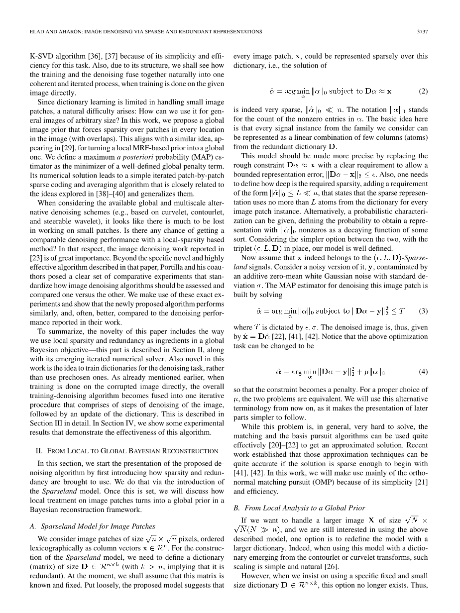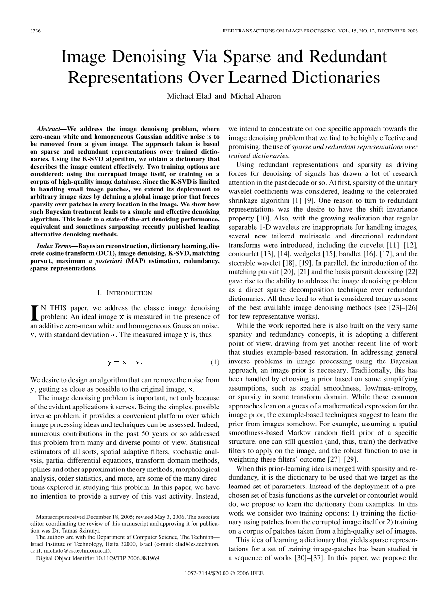 Using redundant representations and sparsity as driving forces for denoising of signals has drawn a lot of research attention in the past decade or so. At first, sparsity of the unitary wavelet coefficients was considered, leading to the celebrated shrinkage algorithm [1]–[9]. One reason to turn to redundant representations was the desire to have the shift invariance property [10]. Also, with the growing realization that regular separable 1-D wavelets are inappropriate for handling images, several new tailored multiscale and directional redundant transforms were introduced, including the curvelet [11], [12], contourlet [13], [14], wedgelet [15], bandlet [16], [17], and the steerable wavelet [18], [19]. In parallel, the introduction of the matching pursuit [20], [21] and the basis pursuit denoising [22] gave rise to the ability to address the image denoising problem as a direct sparse decomposition technique over redundant dictionaries. All these lead to what is considered today as some of the best available image denoising methods (see [23]–[26] for few representative works).