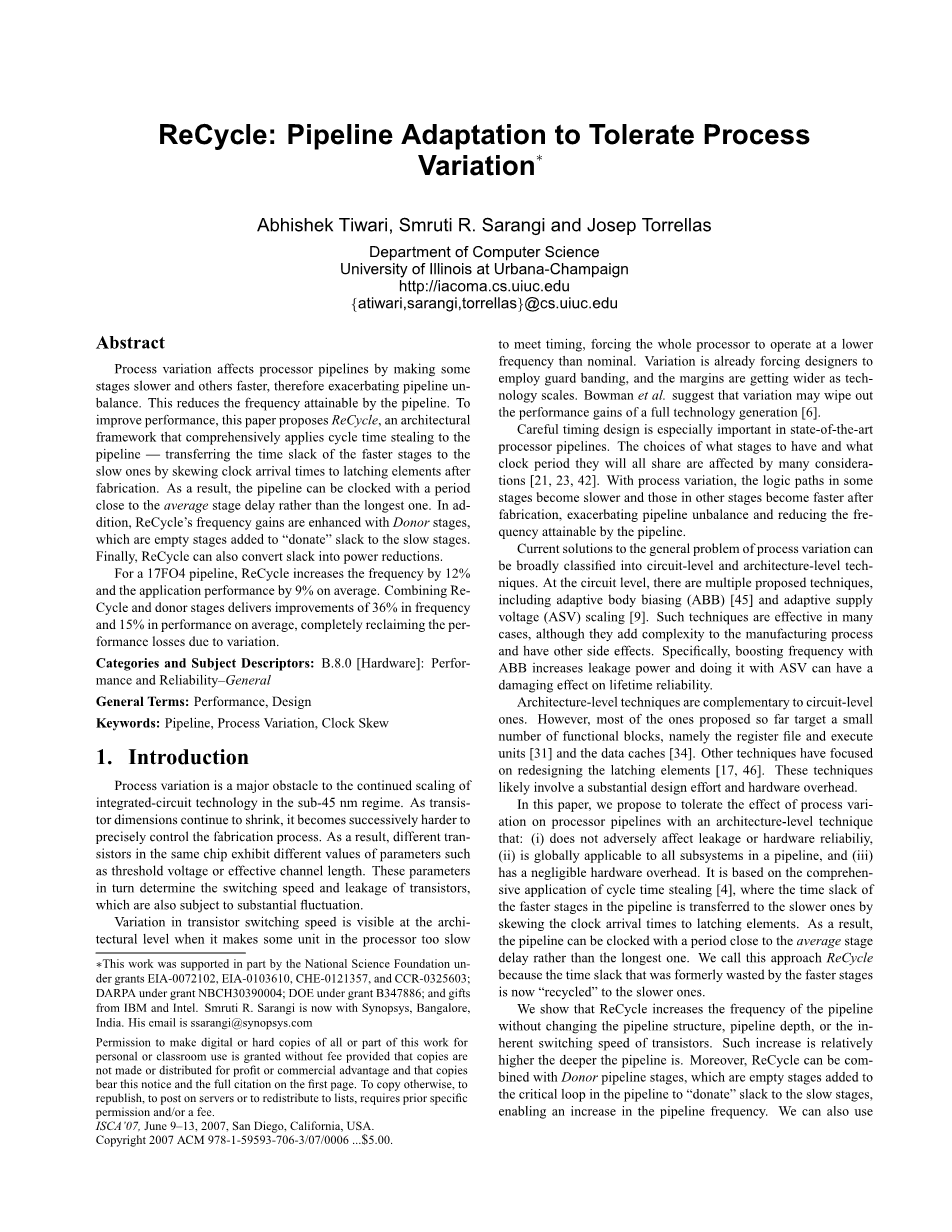 在本文中,我们建议以架构级技术来容忍流程变化对处理器管线的影响:(i)不会对泄漏或硬件可靠性产生不利影响,(ii)全局适用于流水线中的所有子系统,以及 (iii)硬件开销微乎其微。 它是基于循环时间偷窃的综合应用[4],其中通过将时钟到达时间偏移到锁存元件,流水线中较快阶段的时间松弛被转移到较慢的阶段。 因此,管道可以以接近平均阶段延迟的时间进行计时,而不是最长的时间。 我们称之为ReCycle方法,因为之前浪费在更快阶段的时间松弛现在被“回收”到较慢的阶段。