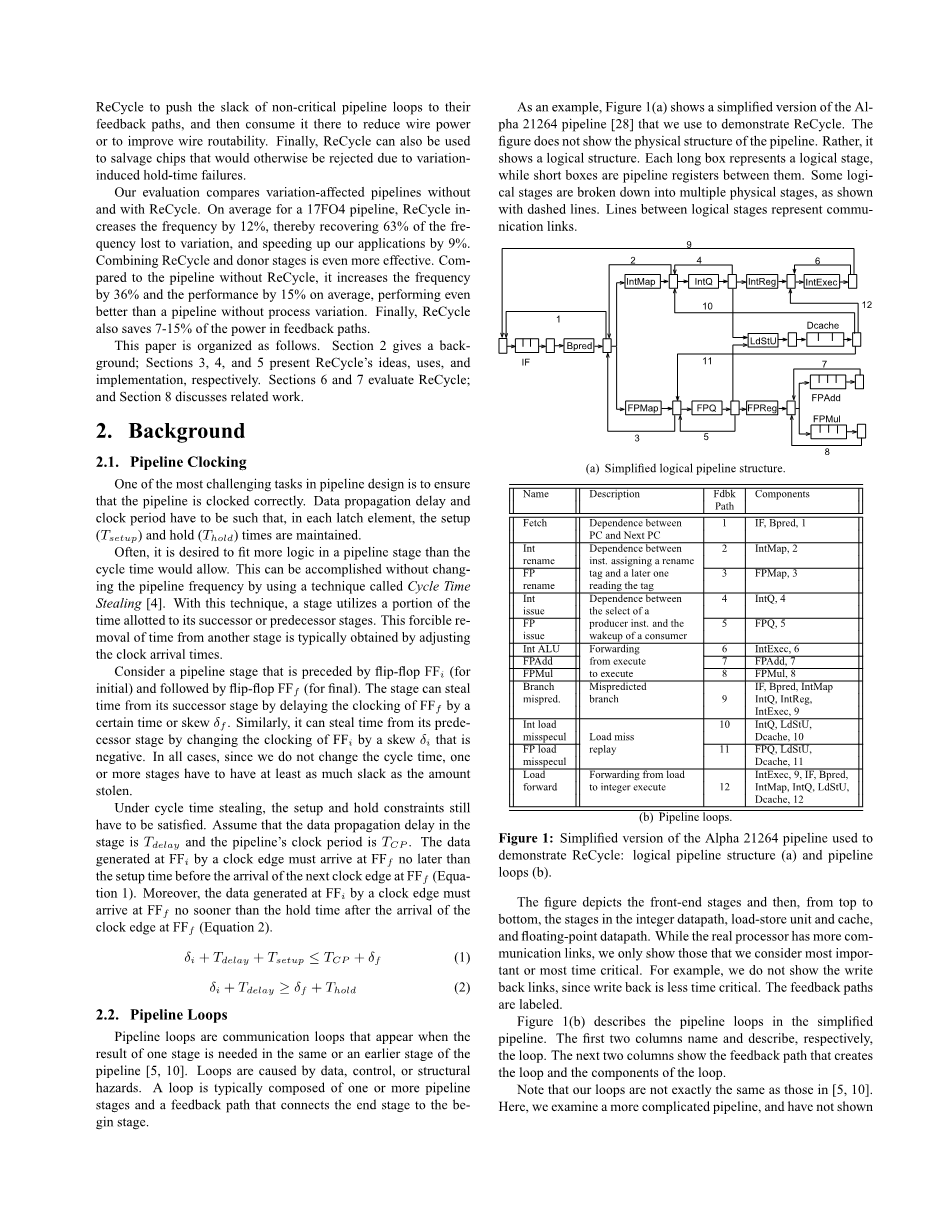 我们显示,ReCycle增加了管道的频率,而不改变管道结构,管道深度或晶体管的固有开关速度。 这种增加在管道越深处越高。 此外,ReCycle可以与Donor流水线阶段相结合,这些阶段是添加到管道中的关键环路的“空白阶段”,以便向慢速阶段“捐赠”松弛,从而增加管道频率。 我们也可以使用ReCycle将非关键管道环路的松弛推送到它们的反馈路径,然后在那里消耗,以减少线路功率或提高线路布线能力。 最后,ReCycle也可以用来挽救由于变化引起的保持时间故障否则会被拒绝的芯片。