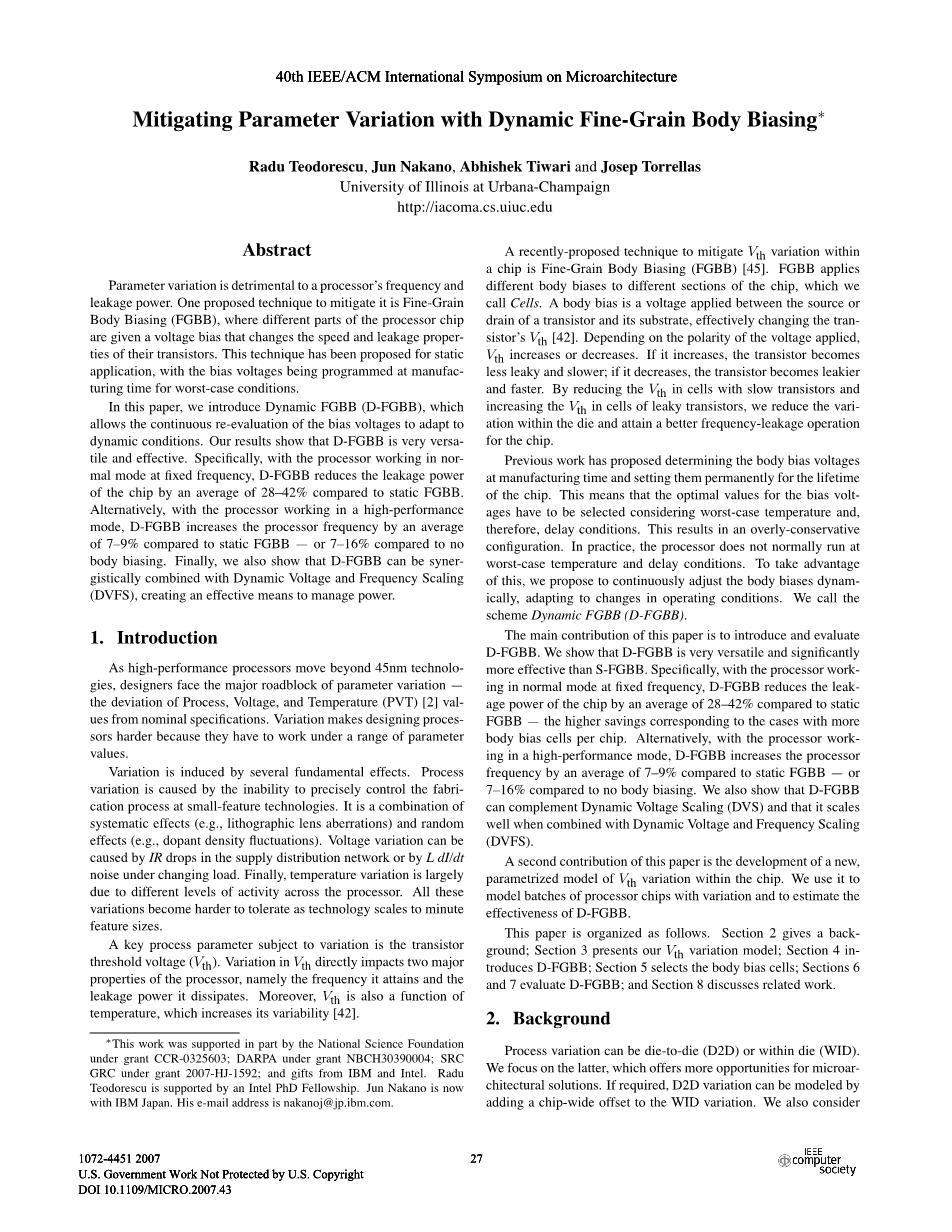 参数变化对处理器的频率和泄漏功率是不利的。一种提出来缓解它的技术是细晶粒偏压(FGBB),其中处理器芯片的不同部分被给予改变其晶体管的速度和泄漏特性的电压偏置。 该技术已经被提出用于静态应用,其中偏置电压在制造时被编程用于最坏情况条件。