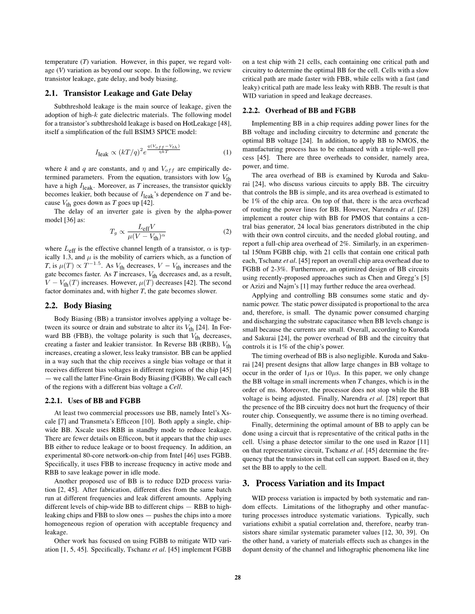其他工作侧重于使用FGBB来减轻WID变化[1,5,45]。 具体来说,Tschanz et al。 [45]实施FGBBon具有21个单元的测试芯片,每个单元包含一个关键路径和电路以确定单元的最佳BB。 具有缓慢的关键路径的单元使用FBB更快,而具有快速(和泄漏)关键路径的单元使得具有更少的RBB泄漏。 结果是WID的速度和泄漏变化减小。