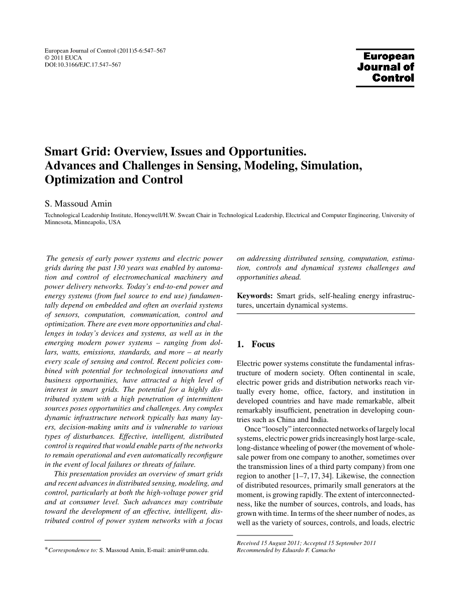 智能电网:概述,问题和机会。传感,建模,仿真,优化和控制的进展和挑战
