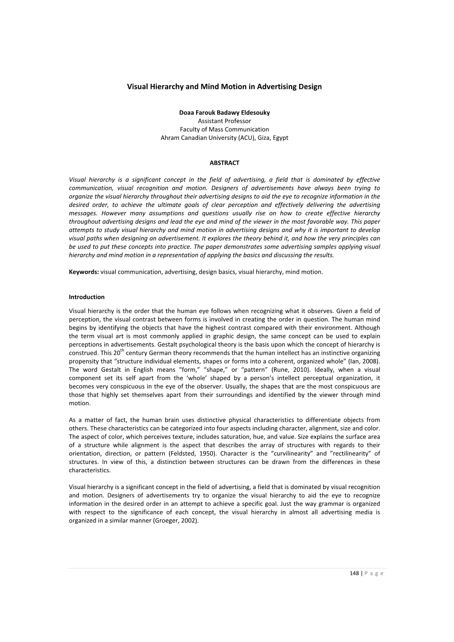 摘要:视觉层次是广告领域的一个重要概念,它以有效的传播、视觉识别和运动为主导。广告设计师一直试图组织整个广告设计的视觉层次,以帮助眼睛识别信息在所需的顺序,以实现最终目标明确的感知和有效地传递广告信息。然而,许多假设和问题通常上升,如何建立有效的层次结构,整个广告设计和领导的眼睛和观众的心态,以最有利的方式。本文试图研究广告设计中的视觉层次和精神运动,以及在设计广告时,如何开发视觉路径是非常重要的。它探讨了背后的理论,以及如何使用的原则可以把这些概念付诸实践。本文演示了一些广告样本应用视觉层次和精神运动的代表性应用的基本知识和讨论的结果。