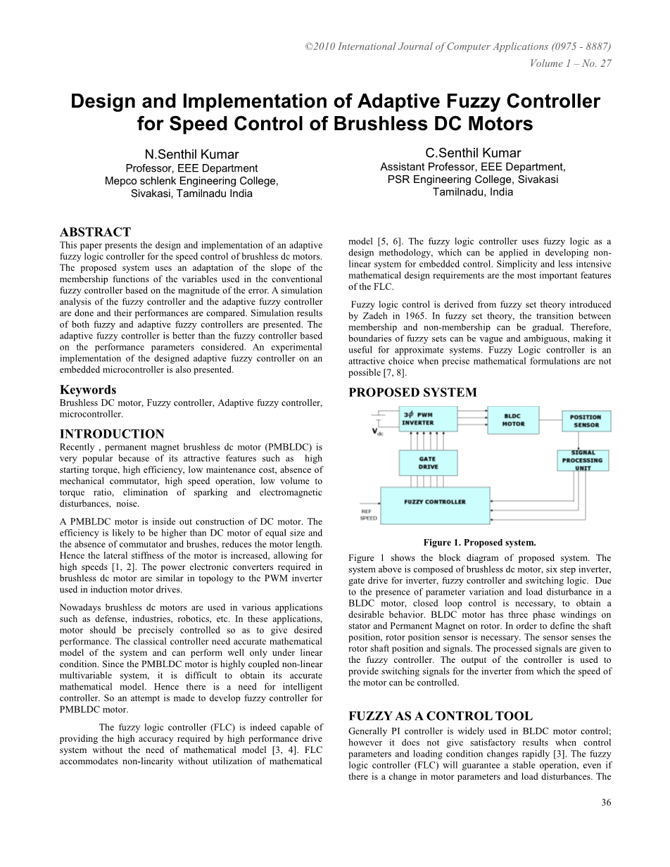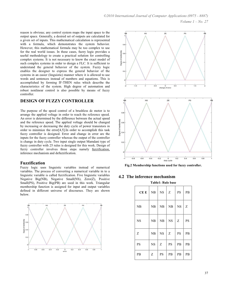 PI控制器广泛应用于无刷直流电机控制,然而,当控制参数和加载条件迅速变化时,得不到满意的结果。但即使电机参数和负载扰动有变化,模糊逻辑控制器(FLC)仍然能保证稳定运行。显然,任何控制系统都将输入空间映射到输出空间。一般来说,计算所需的输出即给定一组的输入。这个数学计算表示用公式表现系统行为。然而,对于现实世界的问题,这个数学公式可能过于复杂。在这种情况下,模糊逻辑提供了有用的方法来创建一个实用的解决方案,用于控制复杂系统。设计一个FLC,没有必要知道复杂系统的精确模型。这足以理解系统的一般行为。模糊逻辑能使设计者能够用一个更容易的方式来表现系统的一般行为,因为它被允许使用单词和句子而不是数字和方程式。这是通过IF-THEN规则描述的系统特性。通过运用模糊控制器,可以实现高自动化程度和鲁棒非线性控制。