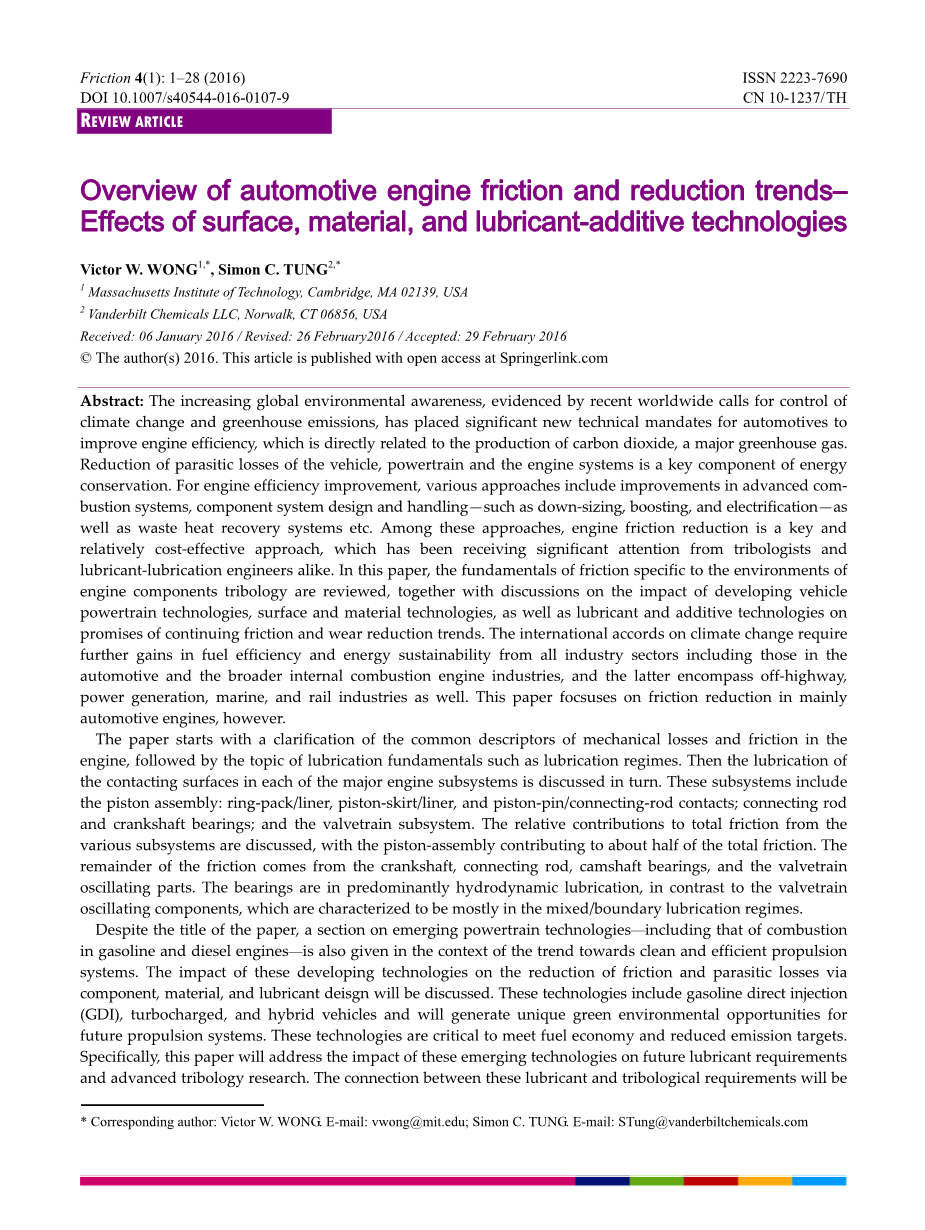 摘 要:近来全球呼吁对环境变化和温室气体排放进行控制表明全球环境意识在不断提高,这种意识凸显了对提高汽车发动机效率的新技术任务的重要性,这与一种主要的温室气体—二氧化碳的产生直接相关。减少车辆,动力结构和发动机系统的寄生损失是能量保护的关键组成部分。为了提高发动机效率,包括改进先进的燃烧系统,组件系统设计和处理的许多方法,如减小尺寸,升压和电气化以及废热回收系统。在这些方法中,减小发动机摩擦是关键和性价比相对较高的方法,其已经受到像摩擦学家和润滑工程师的极大关注。在本文中,讨论了与发动机部件摩擦学环境有关的摩擦的基本原理,以及关于开发车辆动力结构技术,表面和材料技术以及润滑剂和添加剂技术对持续摩擦和减少磨损趋势的影响的讨论。关于气候变化的国际协定要求所有工业部门,包括汽车和更广泛的内燃机工业在燃料效率和能源可持续性方面进一步提高,后者包括非公路,发电,船舶和铁路工业 。然而,本文主要关注于减少汽车发动机的摩擦。