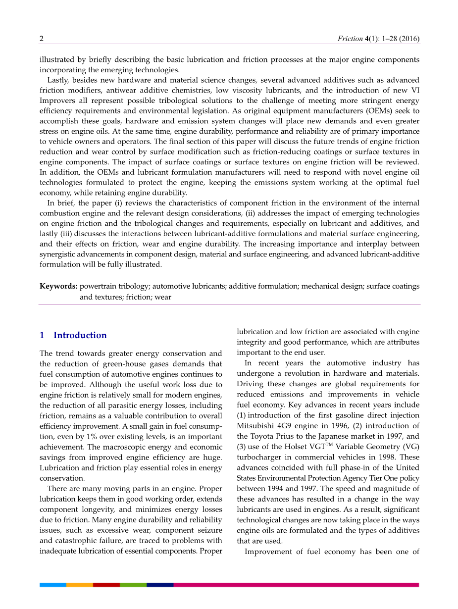最后,除了新的硬件和材料科学的变化,几种先进的添加剂如先进摩擦改性剂,抗磨添加剂化学品,低粘度润滑剂,以及引入新的粘度指数改进剂都代表可能的摩擦学方法以满足更严格的能源效率要求和环境立法的挑战。作为原始设备制造商(OEM)寻求实现这些目标,硬件和排放系统的变化将给发动机油提出新的要求和更大的压力。同时,发动机的耐久性,性能和可靠性对车辆所有者和操作者是最重要的。本文的最后一节将通过改变表面来讨论发动机减小摩擦和磨损控制的未来趋势,改变表面如减少摩擦的涂层或发动机部件的表面纹理。也将回顾表面涂层或表面纹理对发动机摩擦的影响。此外,原始设备制造商和润滑油配方制造商将需要用新的发动机油技术来响应,以保护发动机,保持排放系统在最佳燃料经济性下工作,同时保持发动机耐久性。简而言之,本文(i)回顾了在内燃机及相关设计考虑的环境下,部件摩擦的特性(ii)强调新兴技术对发动机摩擦和摩擦学变化和要求的影响,特别是对润滑剂和添加剂的影响,(iii)最后讨论了润滑剂添加剂配方和材料表面工程之间的相互作用,以及它们对摩擦,磨损和发动机耐久性的影响。另外将会对在组件设计,材料和表面工程以及先进的润滑剂添加剂配方中协同效果的日益增加的重要性和相互作用充分说明。