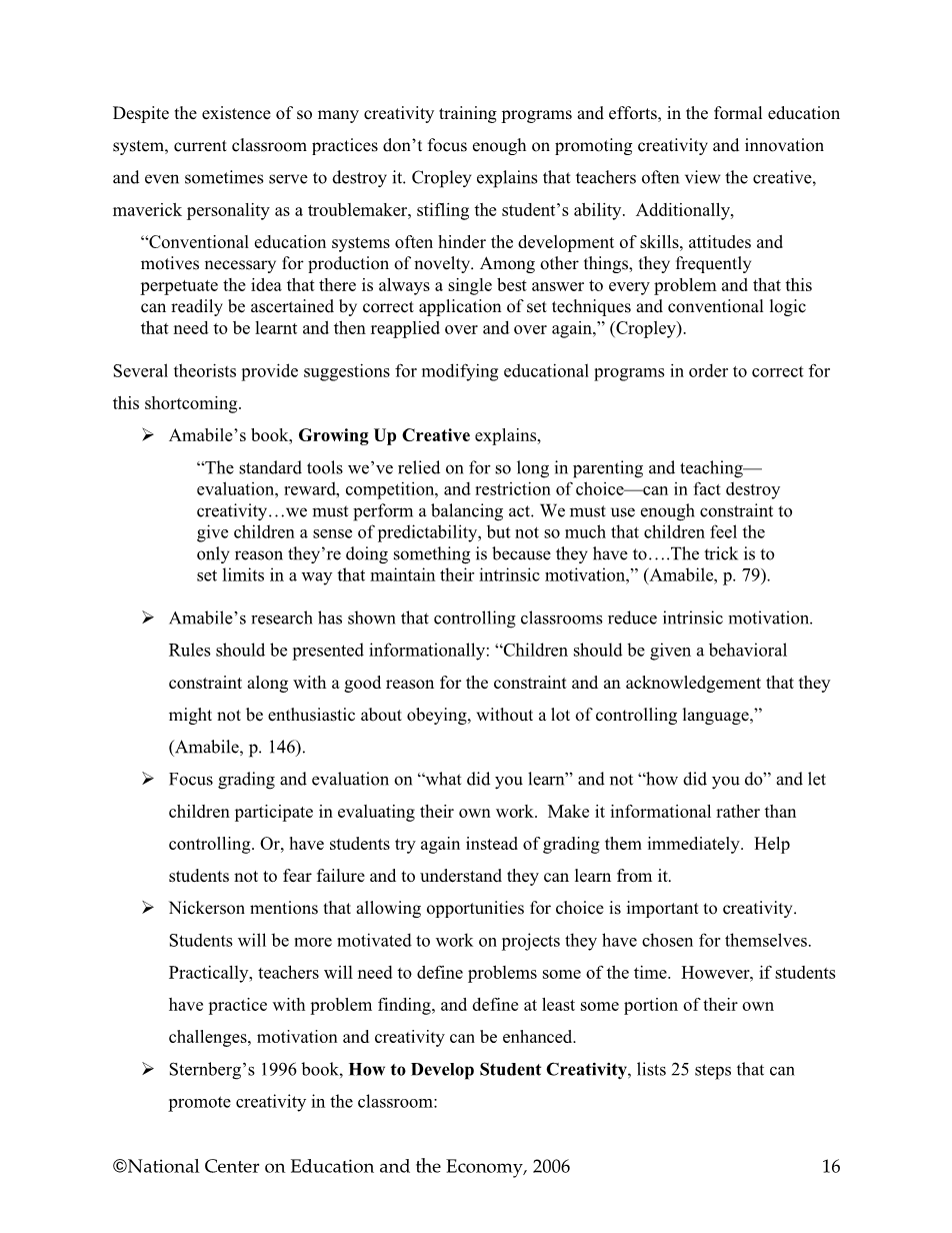 尽管存在如此多的创造力训练计划和努力,在正式的教育系统中,目前的课堂实践并没有集中在促进创造力和创新,有时甚至破坏它。Cropley解释说,教师往往认为创意、特立独行的个性作为一个麻烦制造者,扼杀了学生的能力。另外:
