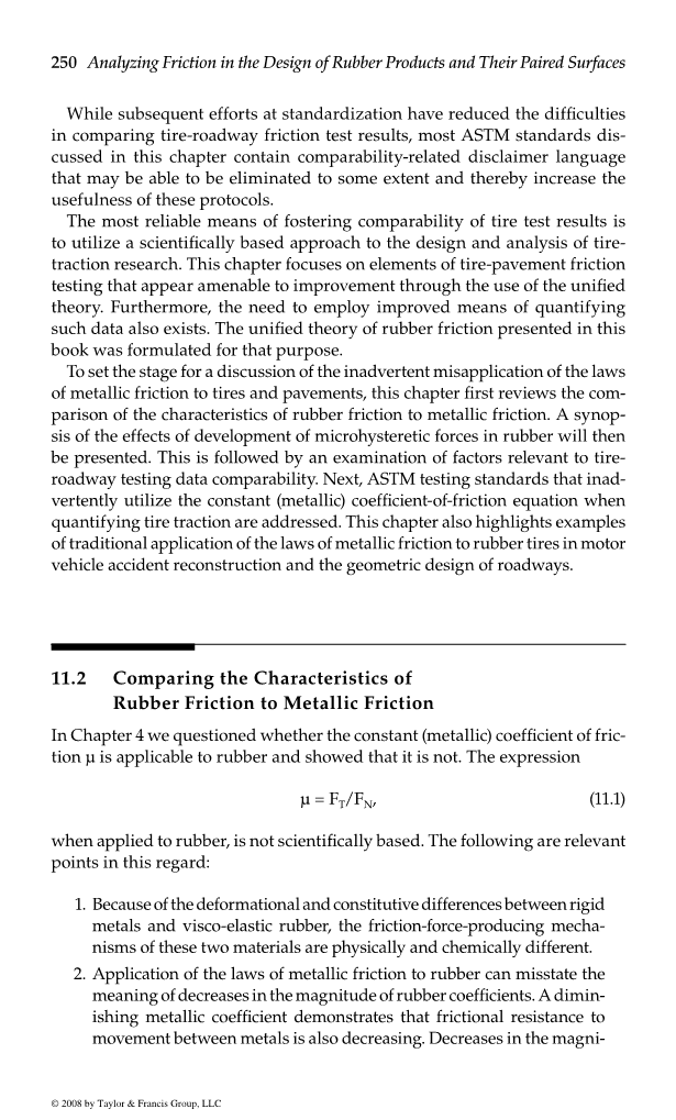 - 金属摩擦定律对橡胶的应用可能会错误地说明橡胶系数的大小减小的意义。减小的金属系数表明,对金属之间的运动的摩擦阻力也在减小。由方程11.1计算的橡胶系数的量值的减小常常意味着增加的运动摩擦阻力的速率减小。