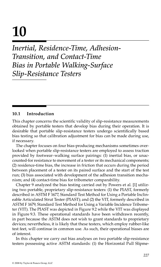 第9章分析了Powers等进行的偏差测试。[1]使用两种便携式专利防滑测试仪:(1)PIAST,以前在ASTM F 1677中描述,使用便携式可倾斜铰接式测试仪(PIAST)的标准测试方法;和(2)以前在ASTM F 1679“使用可变发病部位(VIT)的标准测试方法”中描述的VIT。这些操作标准最近已被撤回,部分原因是ASTM不希望将标准授予专有设备;这些操作标准最近已被撤回,部分原因是ASTM不希望将标准授予专有设备;因此,他们的业务偏见来源于兴趣。