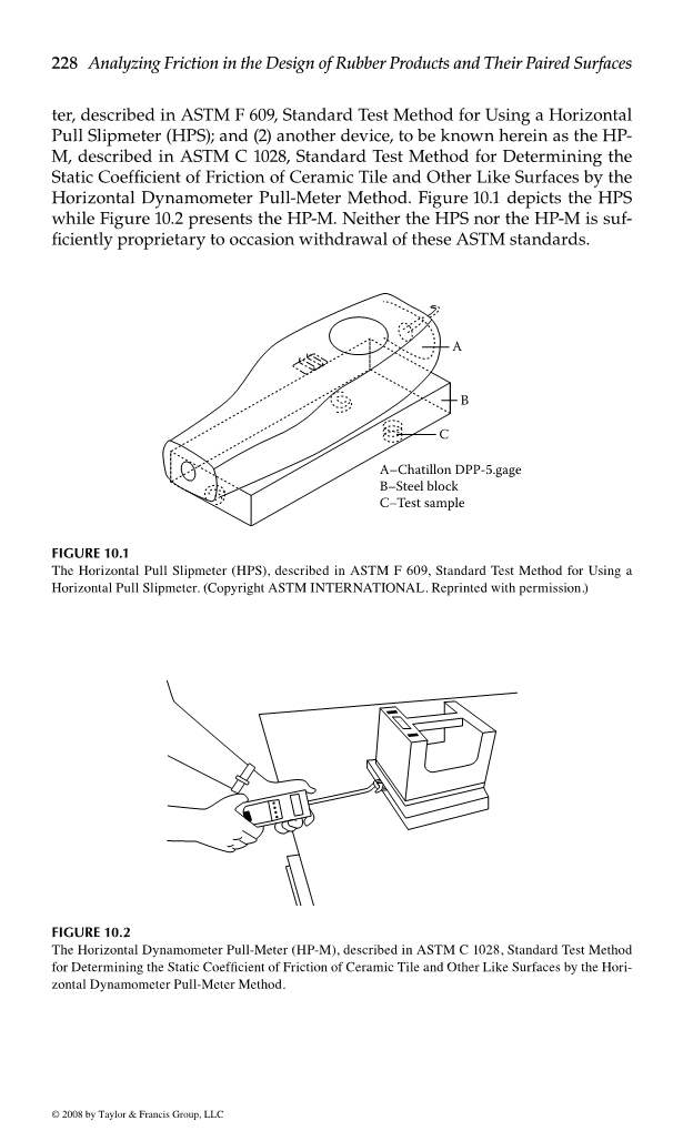 在本章中,我们对具有活跃的ASTM标准的两种便携式防滑测试仪进行偏差分析:(1)ASTM F 609“使用水平拉式滑移机(HPS)的标准测试方法”中描述的水平拉脱流量计;和(2)在ASTM C 1028“通过水平测力计拉力计法测定瓷砖和其它类似表面的静摩擦系数的标准测试方法”中描述的另一种装置,在此称为HP-M。图10.1描述了HPS,而图10.2显示了HP-M。HPS和HP-M均无法有效地撤销这些ASTM标准。