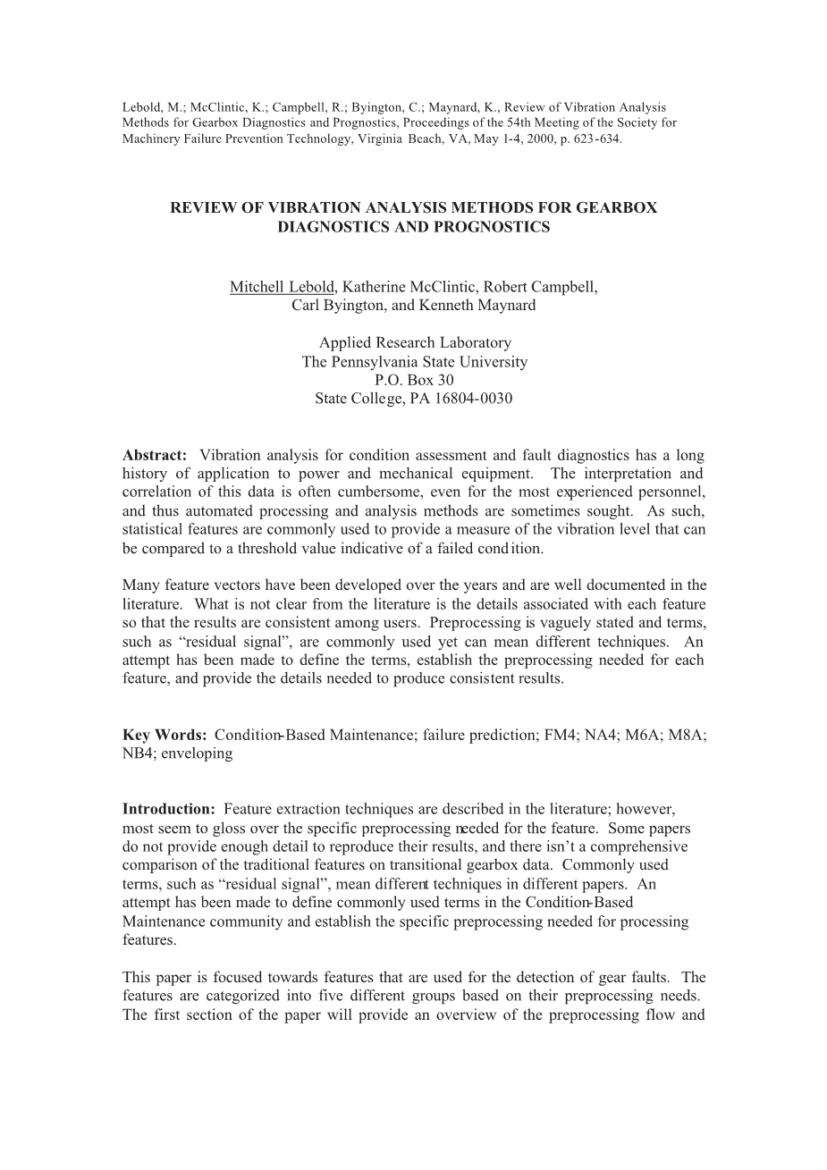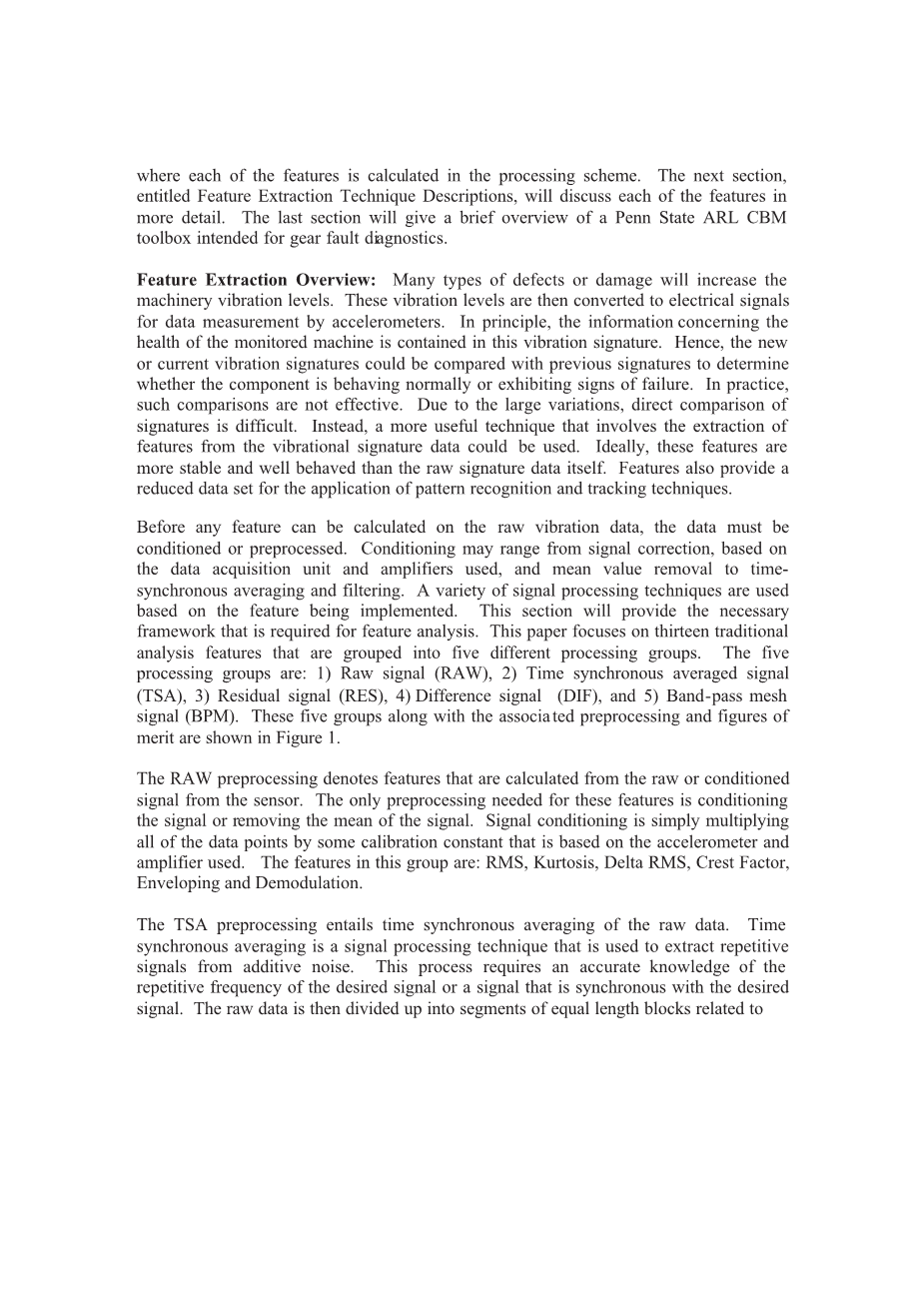 本文的重点是研究用于检测齿轮故障的特征。根据这些特征的预处理需求,它们被分为五个不同的部分。论文的第一部分将提供一个预处理流程的概述和在处理方案中每个特征的计算位置。下一部分特征提取的综述将详细讨论每个特征向量。最后一部分将简要概述用于齿轮故障诊断的Penn State ARL CBM工具箱。
