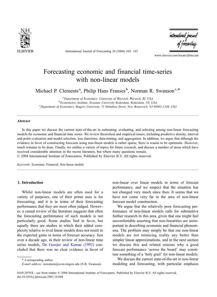 我们研究了当前最先进的非线性模型的建模和预测,着重解决了一些尚未解决的的问题。我们的主题包括合资和有条件的预测密度评估,损失函数,估计和规范,数据挖掘,等等。因此,本文补足了国际预测杂志上该领域文献的不足。