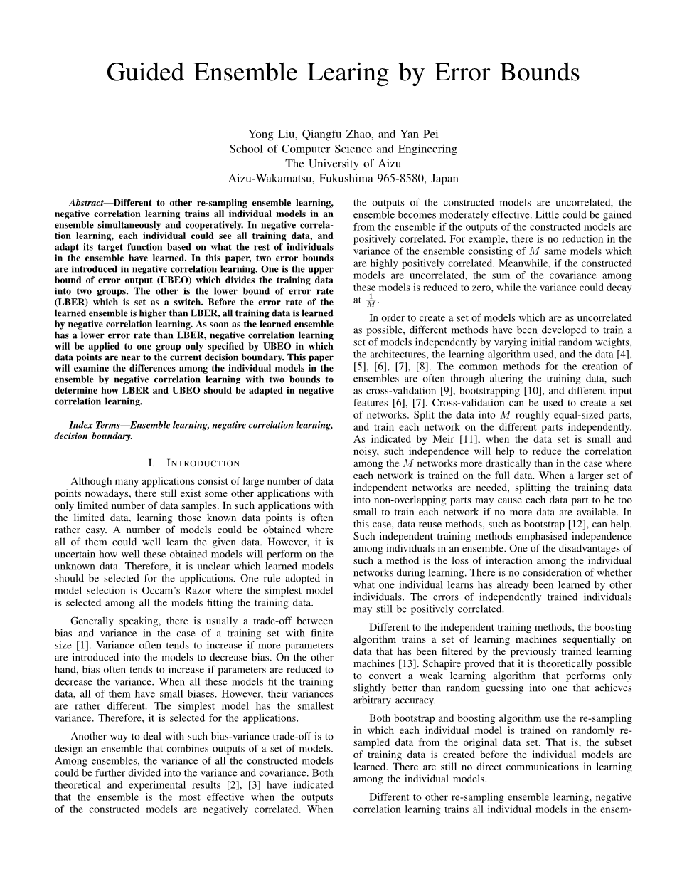 与其他重采样集成学习不同,负相关学习同时并协作地训练集合中的所有个体模型。在负相关学习中,每个个体模型可以看到所有的训练数据,并且基于集合中的其余个体学习到的知识来适应其目标函数。在本文中,在负相关学习中引入了两个误差界限。一个是误差输出的上限(UBEO),它将训练数据分成两组。另一个是设置为开关的误码率的下限(LBER)。在学习集合的误差率高于LBER之前,通过负相关学习来学习所有训练数据。一旦学习集合具有比LBER低的错误率,则负相关学习将被应用于仅由UBE0指定的一组,该集合里的数据点接近当前判定边界。本文将通过带有两个边界的负相关学习来检验整体中各个模型之间的差异,以确定如何使LBER和UBEO适应负相关学习。