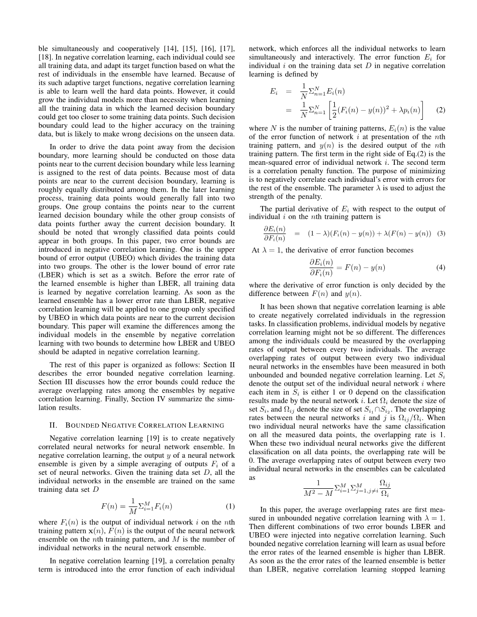 本文的其余部分安排如下:第二节描述了误差有界负相关学习。第三节讨论了误差边界如何通过负相关学习减少组合之间的平均重叠率。最后,第四节总结了仿真结果。