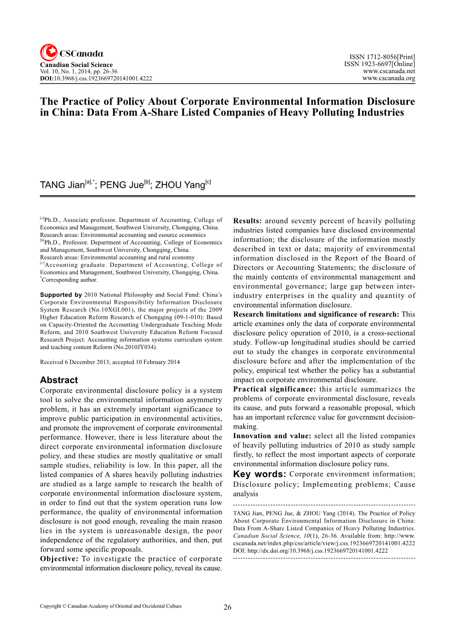 中国在 2008 年 5 月对重污染的行业上市公司实施企业环境信息披露制度,该制度由国家环保总局制定的环境信息披露 (试行) 文件发布,具有法律约束力。应该指出的是,中国的上市公司的年度报告一般是对于前一年的事项进行披露前,例如在2011 年 12 月 31 日,上市公司对2010年的数据和环境信息进行披露,。由于我们数据手机时间为 2011 年 7 月到 2011 年 12 月,在此期间,2011年年度企业环境信息和数据尚未发布,为方便审查的历年制度的运作情况我们定义研究时间为 2010年。