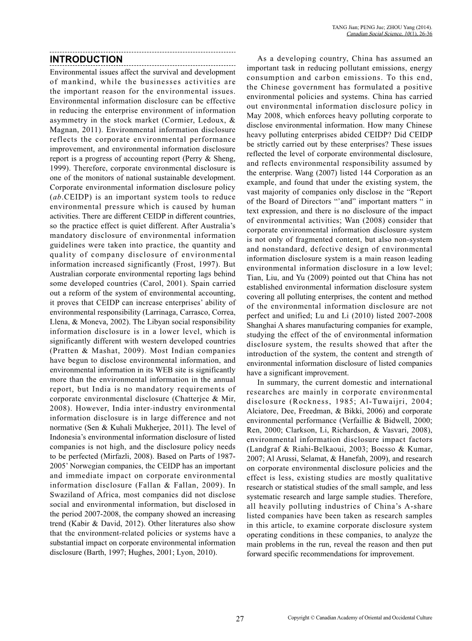 作为一个发展中国家,中国承担了减少污染物排放,建设节能型社会的重要任务。为此,中国政府制定了一个积极的环境政策和制度。中国在2008年5月强制实施重污染企业环境信息披露政策。那么有多少中国重污染企业遵循 CEIDP?这些企业是否又严格执行了CEIDP?这些问题无不反映了企业的环境信息披露水平以及企业承担的环境责任。王 (2007) 以144 上市公司为例,发现在现有制度下,绝大多数公司只在'董事会报告'和'重要事项'等类型的文本中进行披露,却并没有披露的影响环境的活动。Wan(2008 年)认为,企业环境信息披露制度的内容虽然并不零散,但也缺乏系统化和标准化,环境信息披露制度存在缺陷,其设计是处于较低的水平; 对于环境信息披露主要原因,田、刘、禹(2009 年)指出,中国尚未建立覆盖所有污染企业的环境信息披露制度,环境信息披露的内容和方法也不够不完善和统一;以2007-2008年上海上市股票制造企业为例,路和李(2010 年) 研究了样本公司的环境信息披露制度,结果表明,经过系统的引进与阐释,上市公司环境信息披露的内容与强度均有显著的改善。总之,当前的国内和国际研究重点主要在于企业环境披露(Rockness,1985 ; Al -Tu w a i j r i , 2004 ; Alciatore, Dee, Freedman, amp; Bikki,2006) ,企业的环境绩效 (Verfaillie amp; Bidwell,2000; Ren,2000; Clarkson, Li, Richardson, amp; Vasvari,2008)和环境信息披露的影响因素 (Landgraf amp; Riahi-Belkaoui,2003; Boesso amp; Kumar,2007; Al Arussi, Selamat, amp; Hanefah, 2009),对于企业环境信息披露政策研究和相关影响的文章较少,现有的研究大多是定性研究或小样本的统计研究,系统的研究以及大样本研究较少。因此,这篇文章,通过对所有中国A股的重污染行业上市公司来检查公司信息披露系统的运行状况,通过样本数据来分析存在的主要问题,并提出了具体的改进建议。