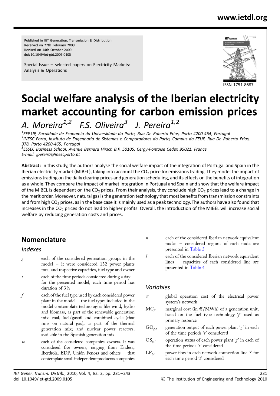在这项研究中,作者通过考虑二氧化碳价格的退休迹象来分析葡萄牙和西班牙在伊比利亚电力市场(MIBEL)的社会福利影响。它们模拟排放交易对每日结算价格和发电调度,它们集成的好处对整体效益的影响。他们比较了一体化市场在葡萄牙和西班牙的影响,并表明该模型的福利影响取决于二氧化碳的价格。从他们的分析来看,他们得出结论是二氧化碳价格高导致优点顺序的变化。此外,天然气是发电技术,最受益于传输限制和二氧化碳价格高,如在基本情况下,它主要是作为一项峰值技术。作者还发现,二氧化碳价格的上涨不会导致更高的利润。总的来说,引入MIBEL将通过降低发电成本和价格来增加社会福利。