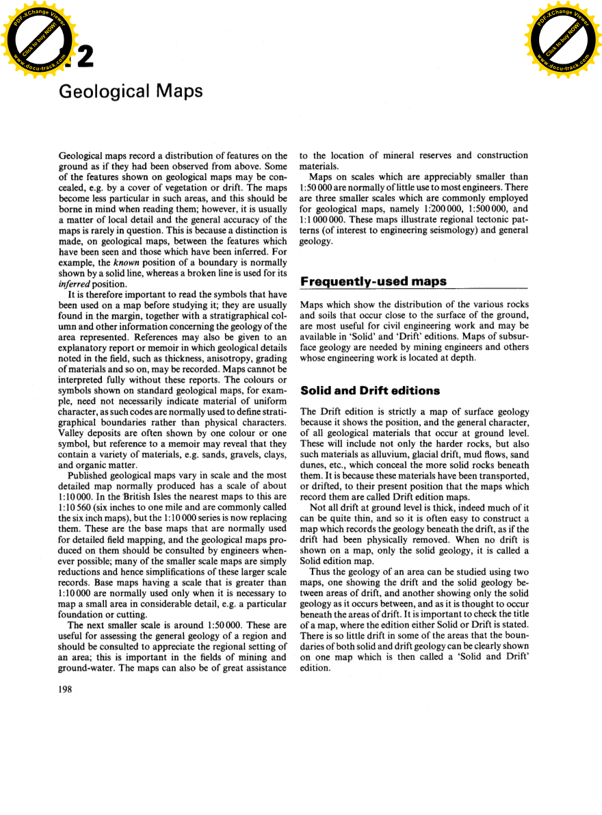 大多数工程师很少使用尺度上比为1:50 000的地质图。有三个较小的尺度是地质图常用的,即1:200000 ,1:500000和1:1000000。这些地图说明区域构造格局(感兴趣的工程地震学)和一般地质。