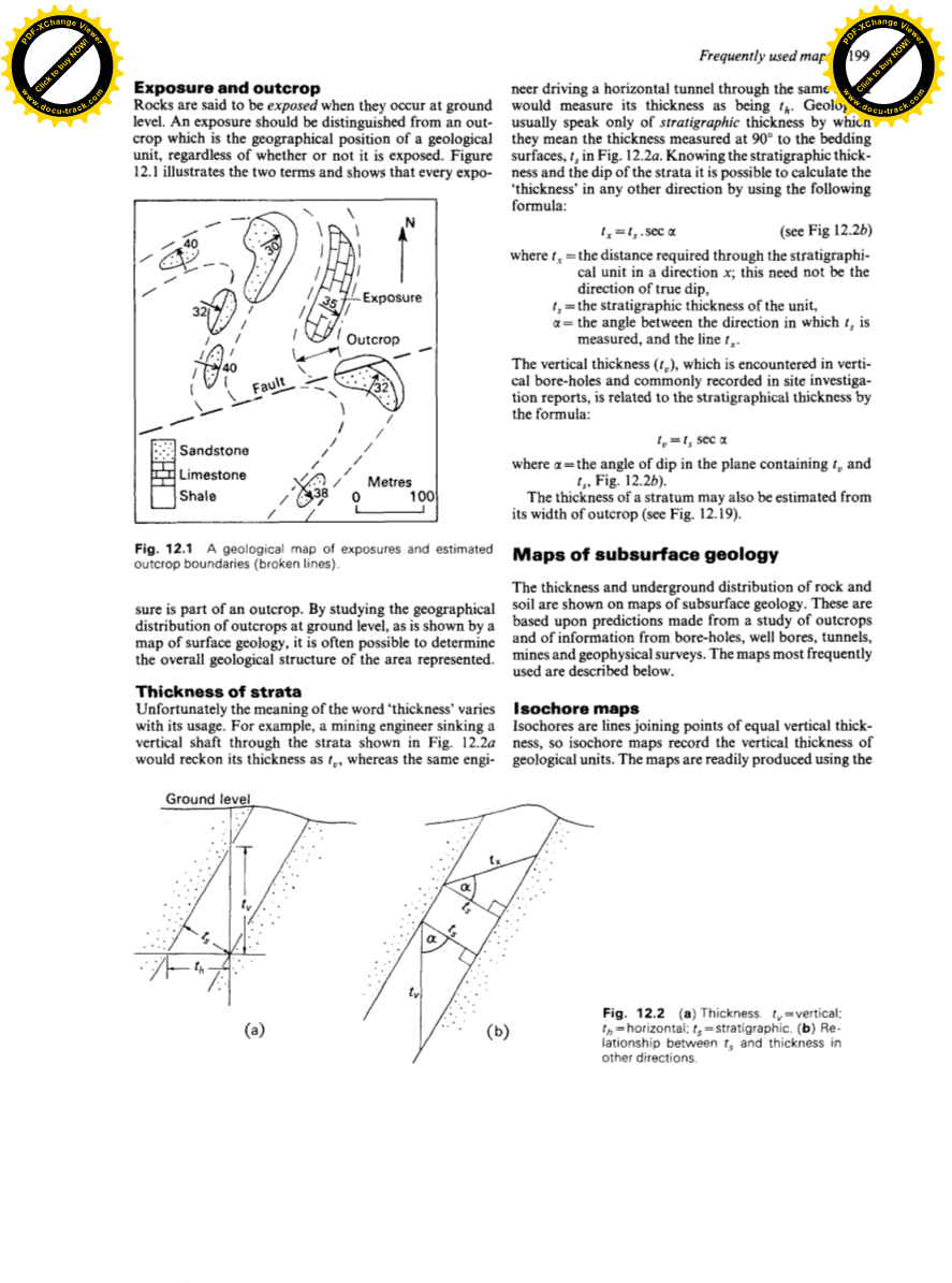 不幸的是,词厚度的含义随其用法而变化。例如,采矿工程师通过图12.2a所示的地层下沉竖井“将其厚度估计为tv,而同一工程师驱动通过其的水平隧道将测量其厚度为th。地质通常只说明地层厚度,它们意味着在与地面表面成90°测量的厚度,图12.2b中的ts 知道地层厚度和地层的倾角,可以通过使用以下公式计算任何其他方向的“厚度”:
