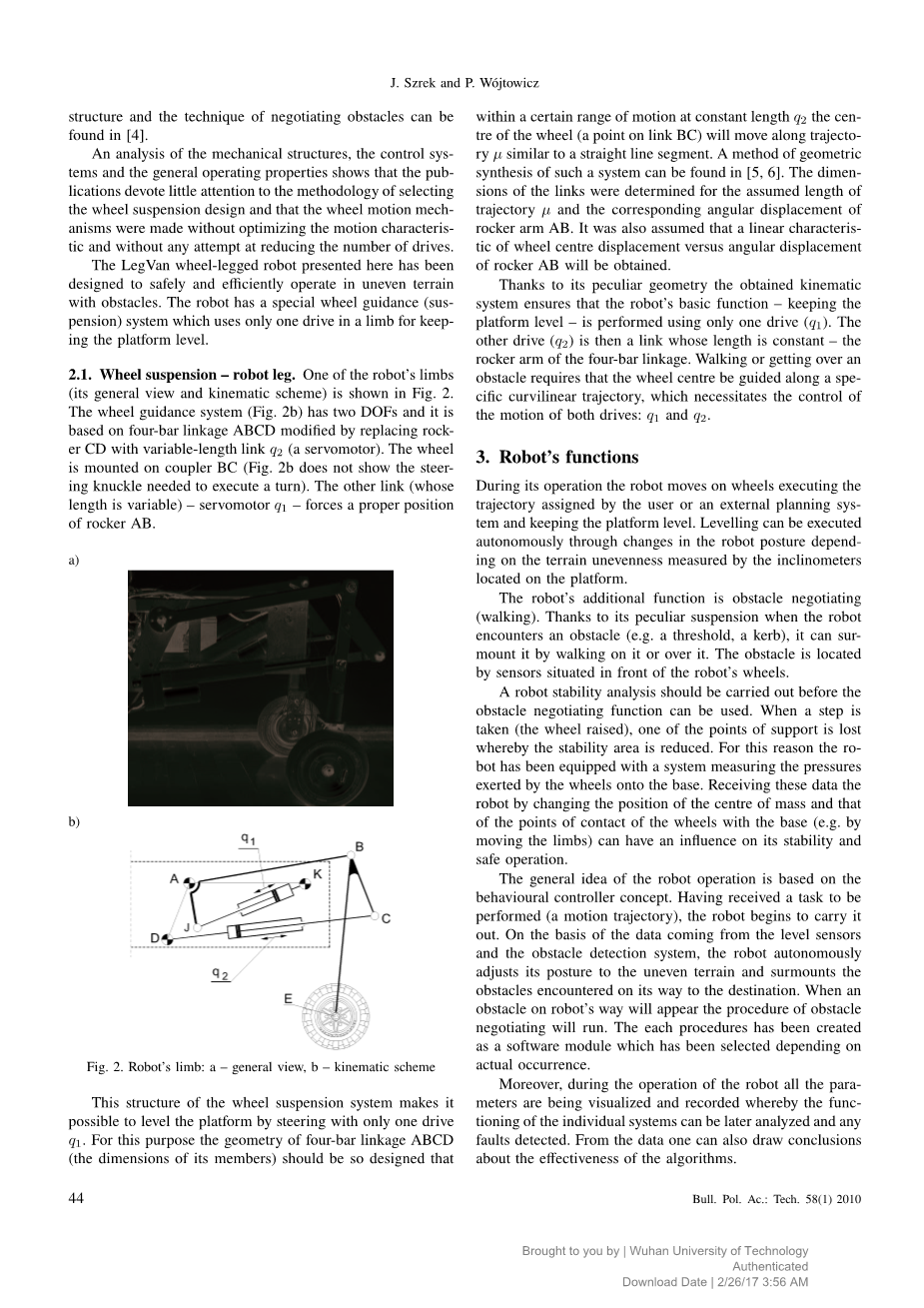 其中一个机器人的四肢(它的外观和运动方案)如图2所示。车轮导向系统(图2b)有两个自由度,它是基于四连杆ABCD的可变长度的链接Q2取代摇杆CD(伺服电机)。车轮安装在连杆BC(图2b显示不需要转弯的转向节)。其他链接(其长度是可变的)–伺服Q1–力摇杆AB的适当位置。