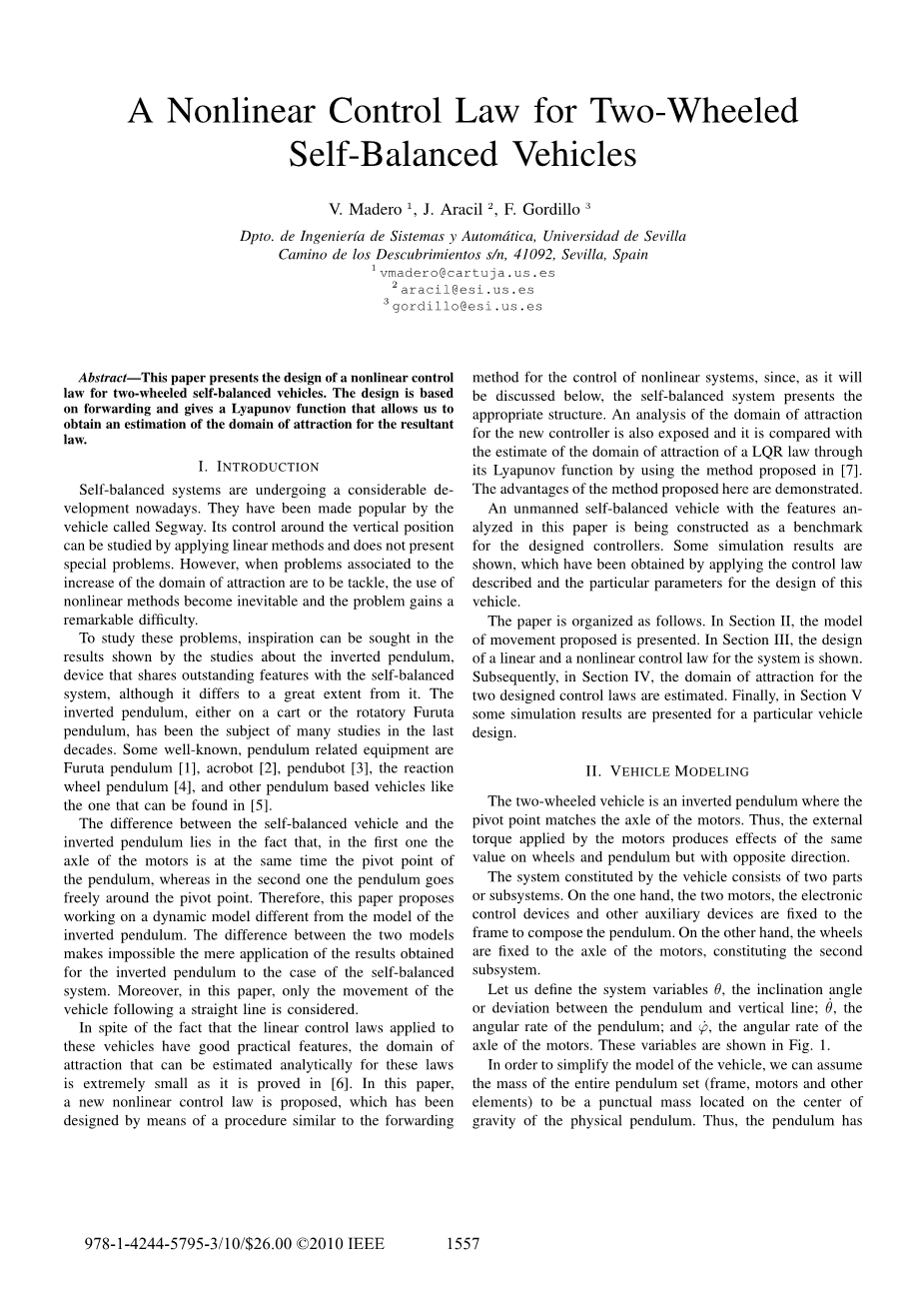 自平衡系统正在经历着相当大的发展。他们被称为Segway的车辆流行。其围绕垂直位置的控制可以通过应用线性方法来研究并且不存在特殊问题。然而,当要解决与吸引力领域的增加相关的问题时,非线性方法的使用变得不可避免,并且问题获得了显着的困难。