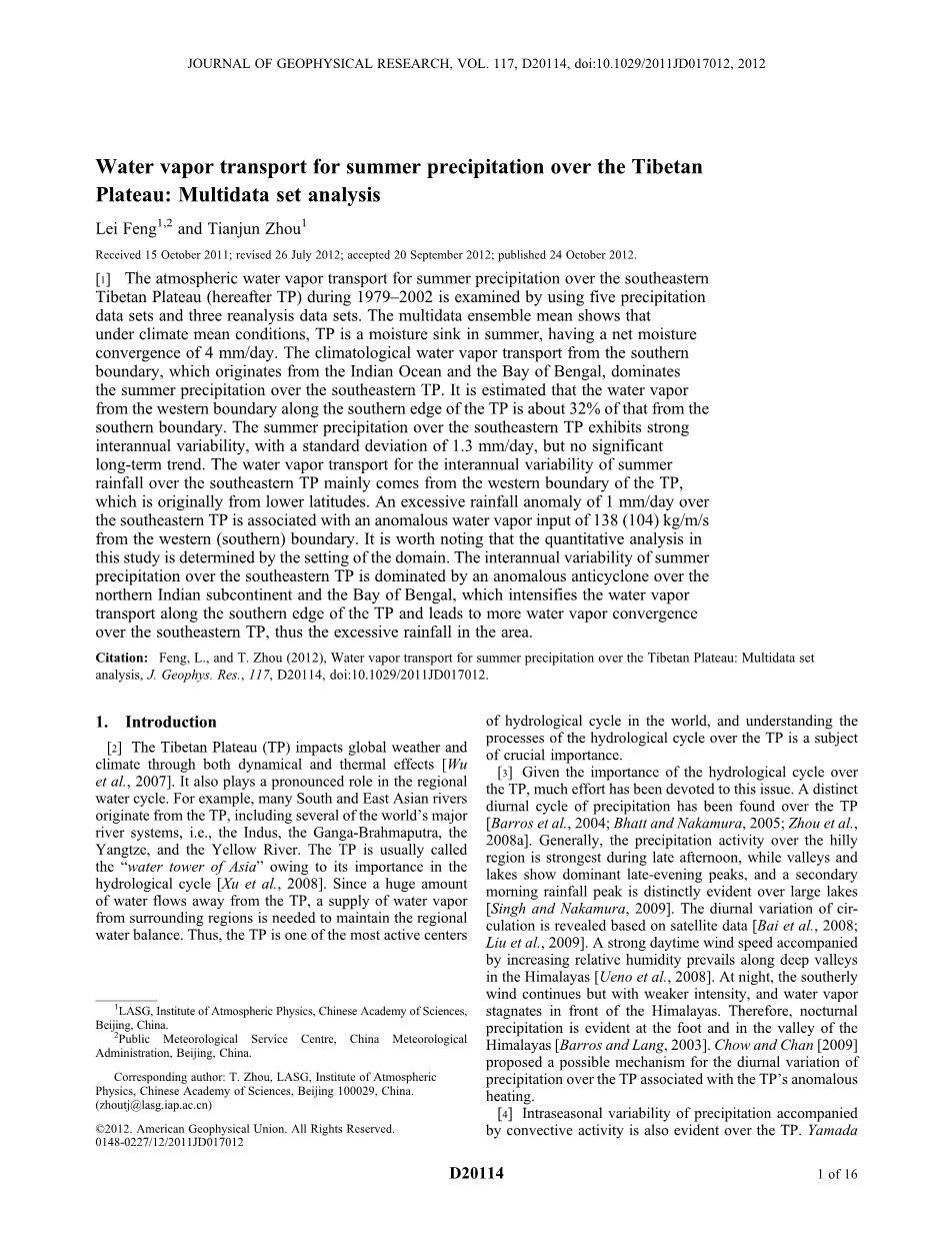 引文: Feng, L., and T. Zhou (2012), Water vapor transport for summer precipitation over the Tibetan Plateau: Multidata set analysis, J. Geophys. Res., 117, D20114, doi:10.1029/2011JD017012.