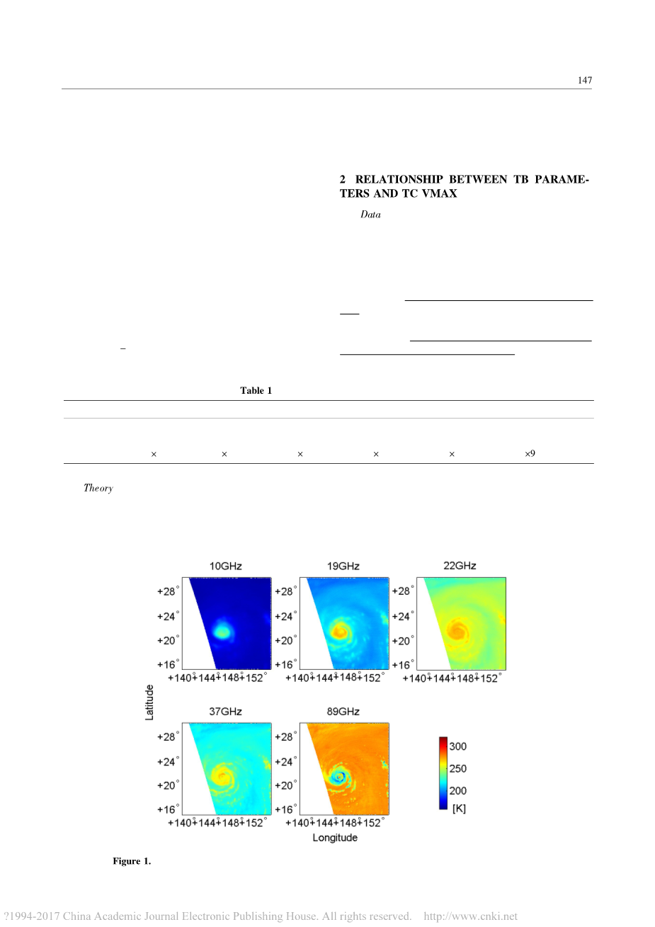 基于以上的观察和模拟分析,我们得出结论,平均值,最小值,最大值TB,和在MWRI不同频率的同心圆或不同半径的环中计算的超过阈值TB的观测比率,都能被用于估算TC强度。