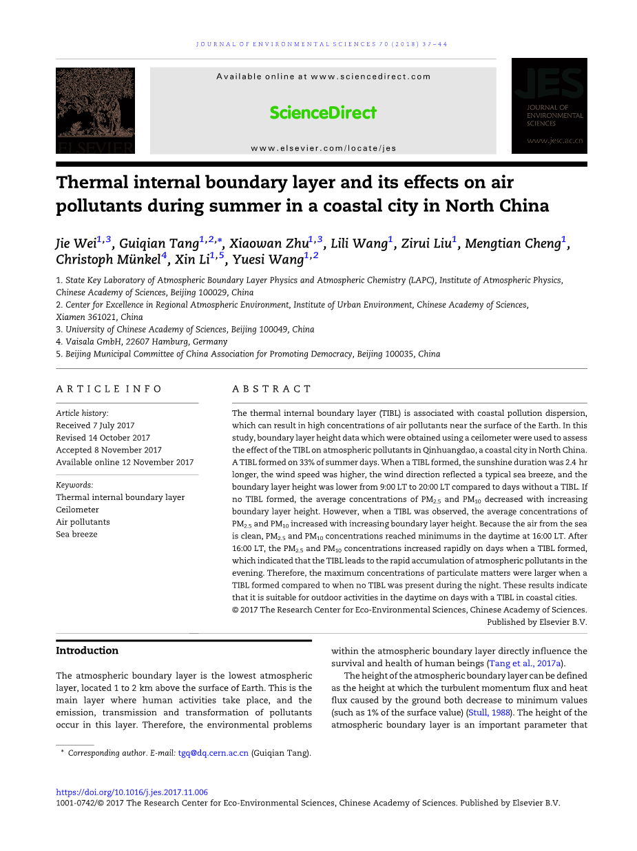 英文题目 Thermal internal boundary layer and its effects onair pollutants during summer in a coastal city in North China