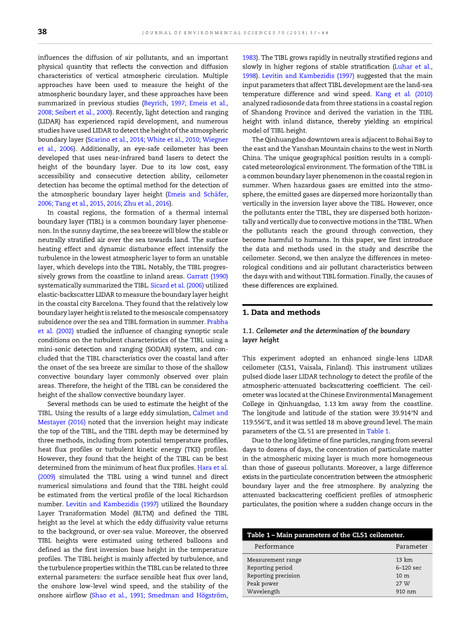 本实验采用了一种增强型单透镜激光探测仪(CL51, Vaisala, Finland)。该仪器利用脉冲二极管激光雷达技术检测大气衰减后散射系数的廓线。云高仪安装在距海岸线1.13公里的秦皇岛中国环境管理学院内。所在的经纬度分别为39.914°N和119.556°E,安置高度距离地面18米。CL 51的主要参数见表1。