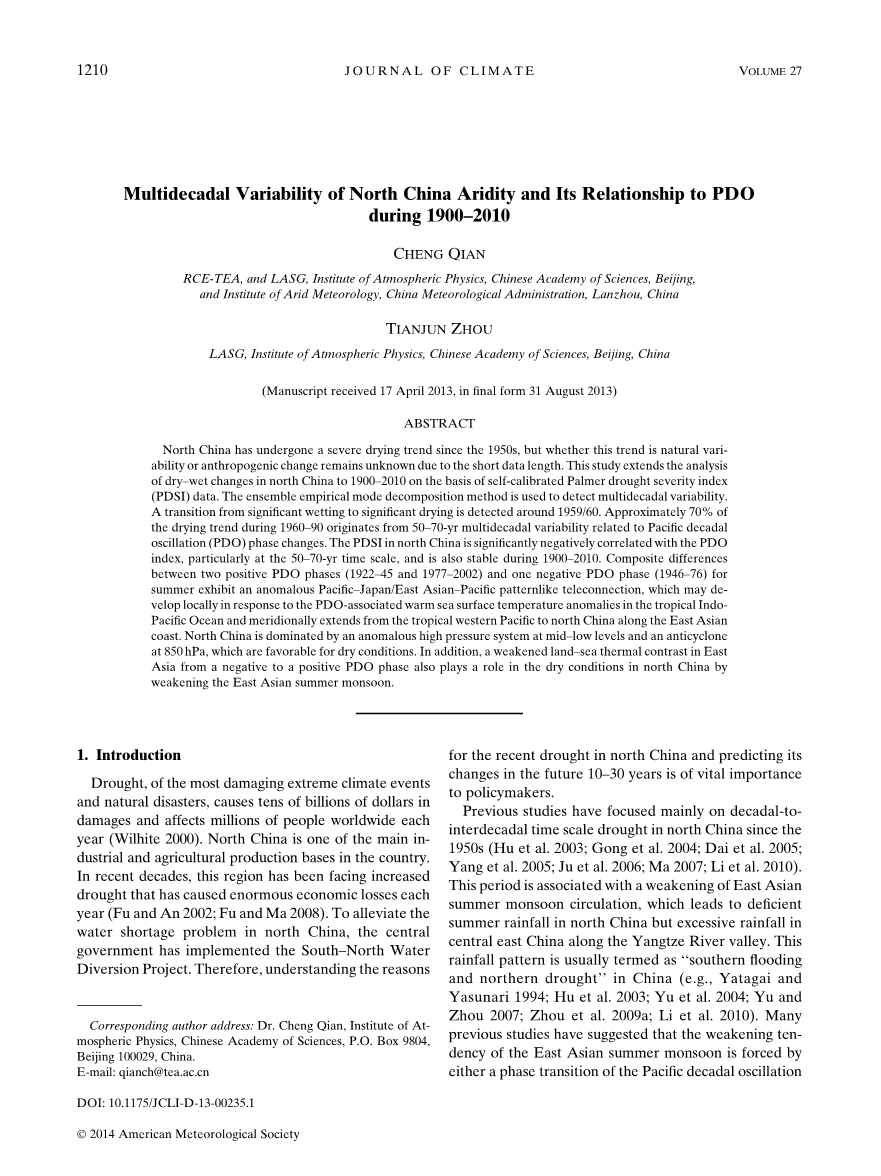 此外,1960-80年期间多年气候变化的作用(Schlesinger和Ramankutty,1994;Wu等人,2011)或50-70年(Minobe 1997,1999)的干湿演化,特别是近期华北地区的干旱化,尚不清楚。本研究的主要目的是考察华北地区1900-2010年干湿的演化过程,并探讨其与多年尺度PDO相变的关系。采用自修正 Palmer干旱指数(PDSI)数据(Dai 2011年a),该数据是气象干旱最显著的指数,考虑了降水和温度变化对大气水分补给(降水)和需求(潜在蒸散)之间地表水平衡的累积效应。通过使用一种称为集成经验模式反合成(EEMD)方法的自适应和时间局部数据分析工具来识别多年的变化(Wu等人, 2009;Huang和Wu, 2008)。结果表明,华北地区1960-90年的干旱化约有70%来源于50 - 70年的多年气候变化,这与PDO的变化模式有关。华北地区PDSI与PDO指数的负相关在整个20世纪的几十年时间尺度上是稳定的。我们的结果对10 - 30年的十年预测是一个有用的启示(Meehl等人,2009)。