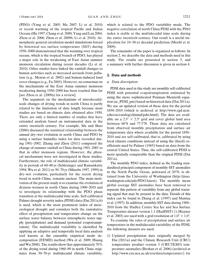 以往的研究主要集中在20世纪50年代以来华北地区的年代际干旱 (Hu等人,2003年;Gong等人,2004年;Dai等人,2005年;Yang等人,2005年;Ju等人,2006年;Ma 2007年;Li等人,2010年)。这一时期与东亚夏季季风环流减弱有关, 导致华北夏季降水不足, 但中国中东部沿长江流域降雨偏多。这种降雨模式在中国通常被称为 '南涝北旱' (如yatagai和yabunari, 1994年;hu 等人, 2003年;yu 等人, 2004年;Yu、Zhou 2007年;Zhou等人, 2009年;Li等人, 2010年)。以往许多研究表明, 东亚夏季风减弱的趋势是受太平洋年代际振荡的影响(Yang等人 2005; Ma 2007; Li等人2010)或者是热带太平洋和印度洋最近的增暖(Hu 1997; Chang等人,2000; Yang和Lau 2004;Zhou等人,2006; Zhou等人, 2009b; Li等人,2010)。