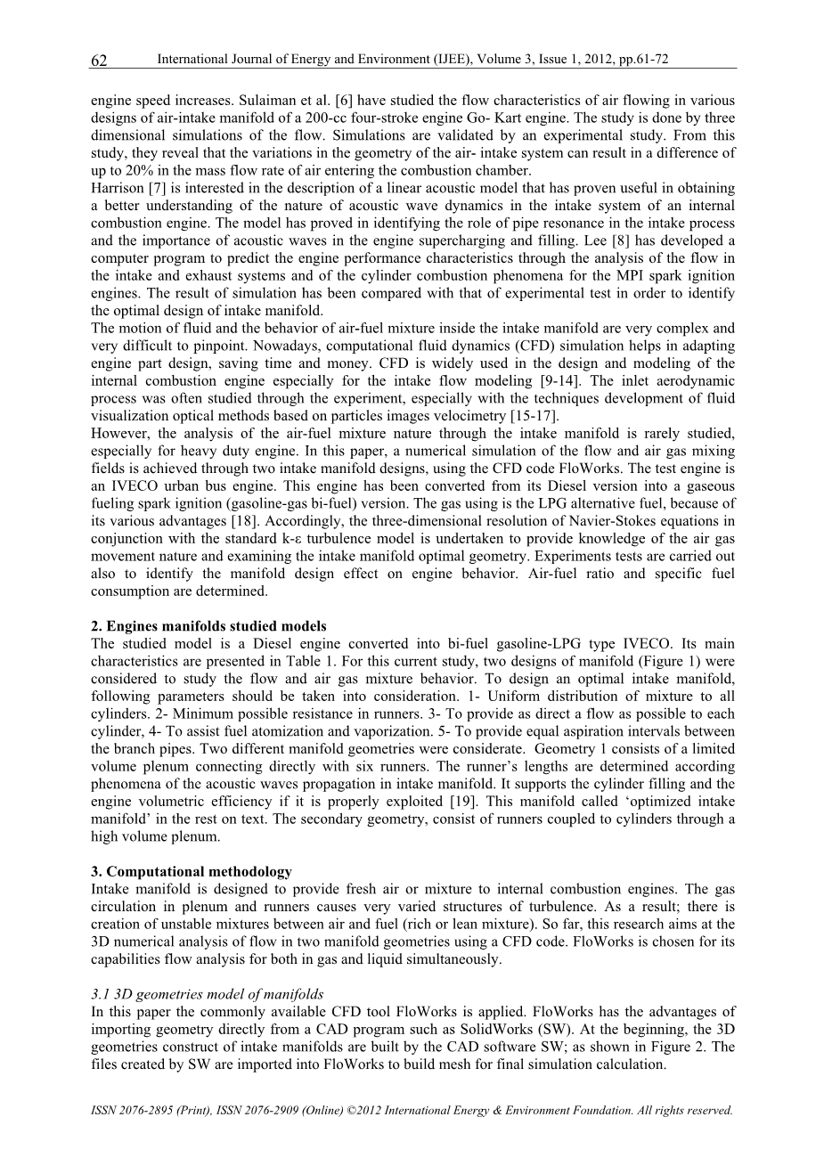 然而,对进气歧管的空气-燃料混合物性质的分析研究很少,特别是关于重型发动机。在本文中,通过使用CFD软件FloWorks设计两个进气歧管实现了流动和气体耦合的数值模拟。测试发动机是IVECO城市公交车发动机。该发动机已经从其柴油版转变为气体燃料火花点火(汽油 - 二氧化碳)版本。,因为LPG燃料的各种优点[18],所以使用其作为替代燃料。因此,采用与标准k-ε湍流模型结合的Navier-Stokes方程来分析提供空气和LPG混合气的气体运动情况,并确定进气歧管的最佳几何形状。另外还进行实验测试,来确定歧管设计对发动机性能的影响,并确定空燃比和燃料消耗比。