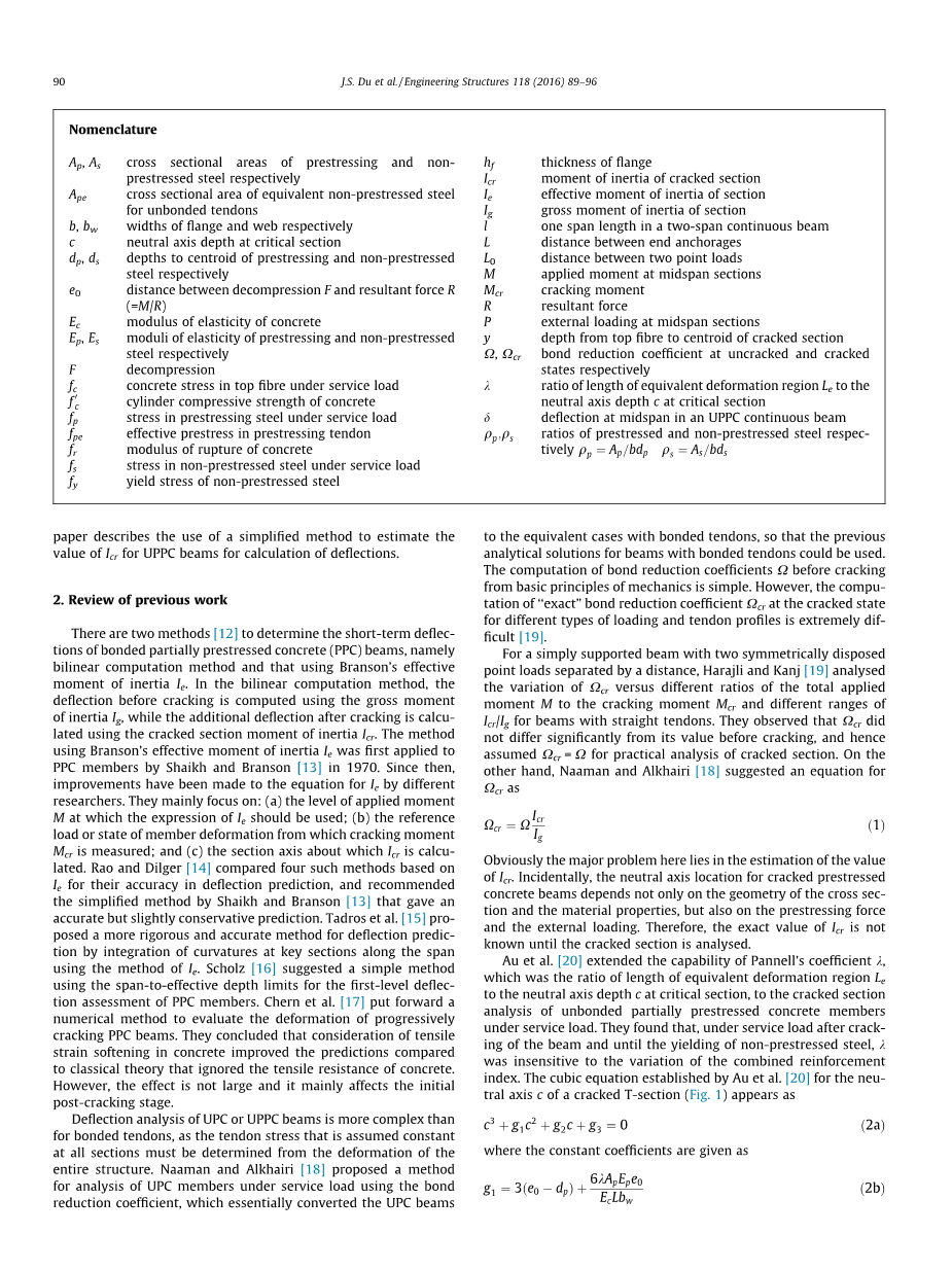 在桥梁结构中,通常优选连续梁简单的支撑梁,因为前者需要更少的运动接头,提供更好的骑行质量,并允许较低的维护成本。对于相同的跨度长度和截面,连续梁还具有比简单的支撑梁更高的刚度。以前无粘结预应力混凝土(UPC)和无粘结的研究部分预应力混凝土(UPPC)构件主要是在极限状态下弯曲,但很少有在服务负载条件下处理行为违反。虽然基于不同理论的数值方法可以用于调查UPPC的变形他们的连续梁在适用性和极限状态下对实用设计人员来说是不方便的。确定断裂后的UPPC连续梁的变形需要裂纹Icr的惯性。由于钢筋和混凝土之间缺乏粘结,因此很难计算完全适用于特殊加载的UPPC连续梁。本文介绍了使用简化方法来估计UPPC波束的值用于计算失效。