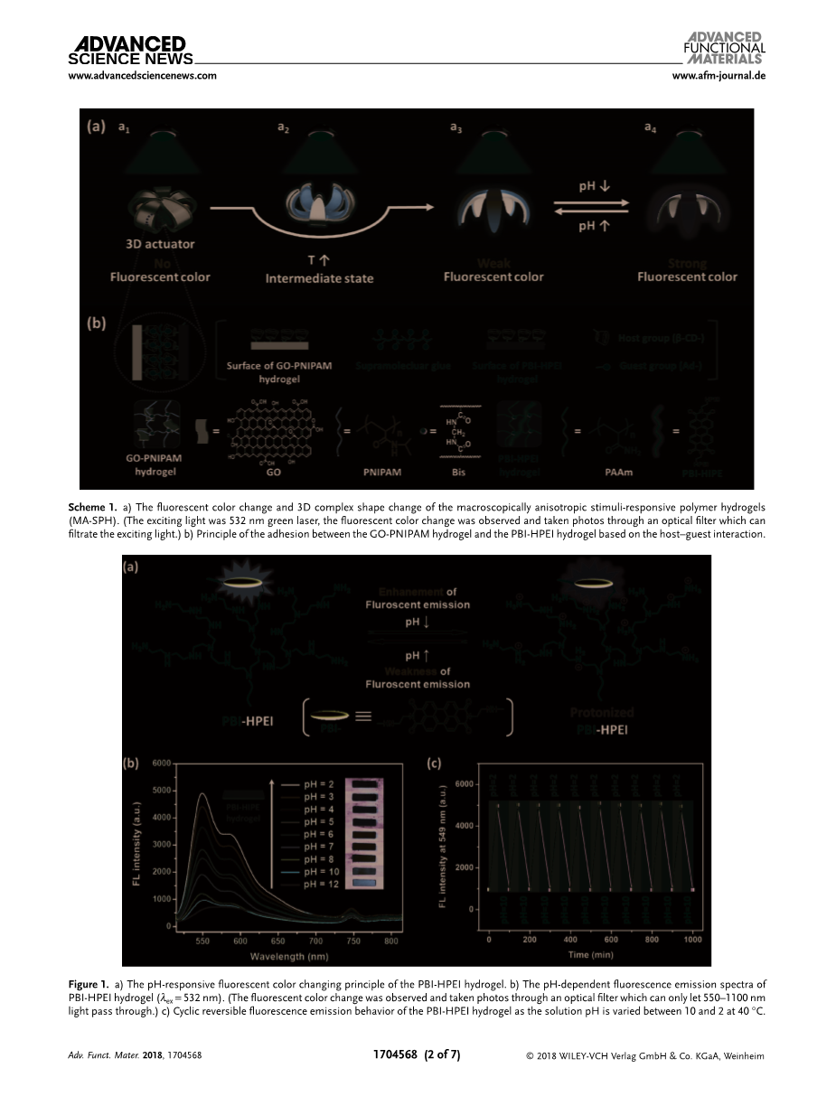 在此,我们提出了具有协同形状变形和变色功能的宏观各向异性复合聚合物水凝胶(方案1a)。为此,制备了热响应性氧化石墨烯-PNIPAM(GO-PNIPAM)水凝胶片和pH响应性苝双亚胺化超支化聚乙烯亚胺荧光水凝胶片。GO-PNIPAM水凝胶在其折叠状态下与PBI-HPEI水凝胶结合,通过基于主客体相互作用【14】的超分子胶来获得双层水凝胶(方案1b;图1,支持信息)。将双层水凝胶裁剪成星形,然后转移到寒冷环境中,以诱导PNIPAM网络扩展引起的PNIPAM层碰撞,从而可以实现三维水凝胶驱动器。在低温下,PBI-HPEI层被GO-PNIPAM层覆盖,这阻挡了大部分激发光,因此没有观察到来自PBI-HPEI层的荧光(方案1a1)。如果驱动器暴露于温暖的环境中,则GO-PNIPAM层将由于PNIPAM网络的折叠而收缩,并导致驱动器的展开,从而允许PBI-HPEI内层暴露于光,并触发荧光的断开开关(方案1a2,a3)。此外通过降低环境的pH,荧光将增强(方案1a3,a4)。为了将形状变形和荧光变色特性集成到一个水凝胶系统中,我们的策略可以为具有协同多功能的仿生智能系统的设计提供新的见解。