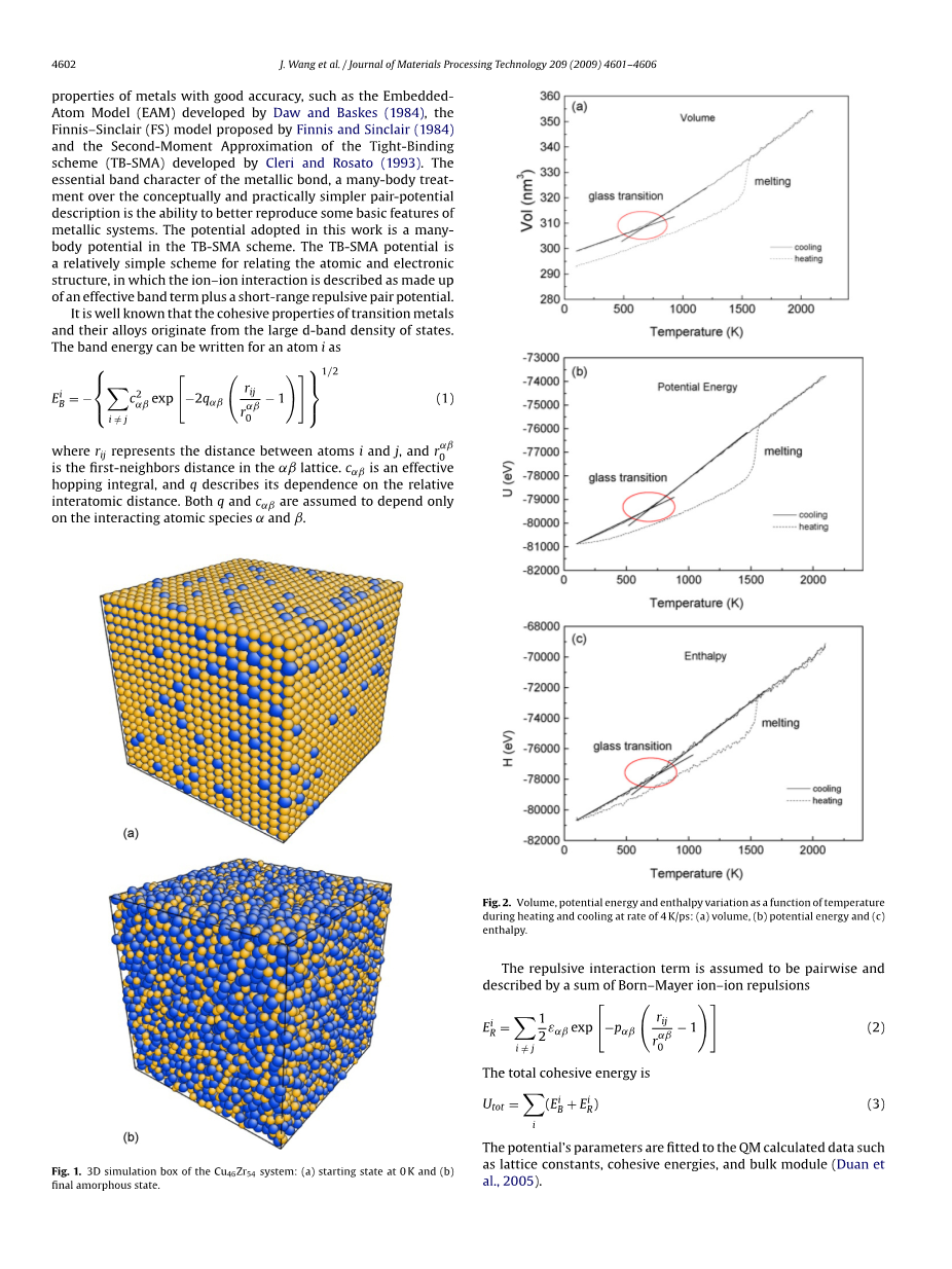 在当前的分子动力学分析中,模拟了产生金属玻璃的全过程,包括熔化、平衡和冷却过程。图2示出了在以4K/ps速率加热和冷却过程中体积、势能、能量和焓作为温度的函数的变化,