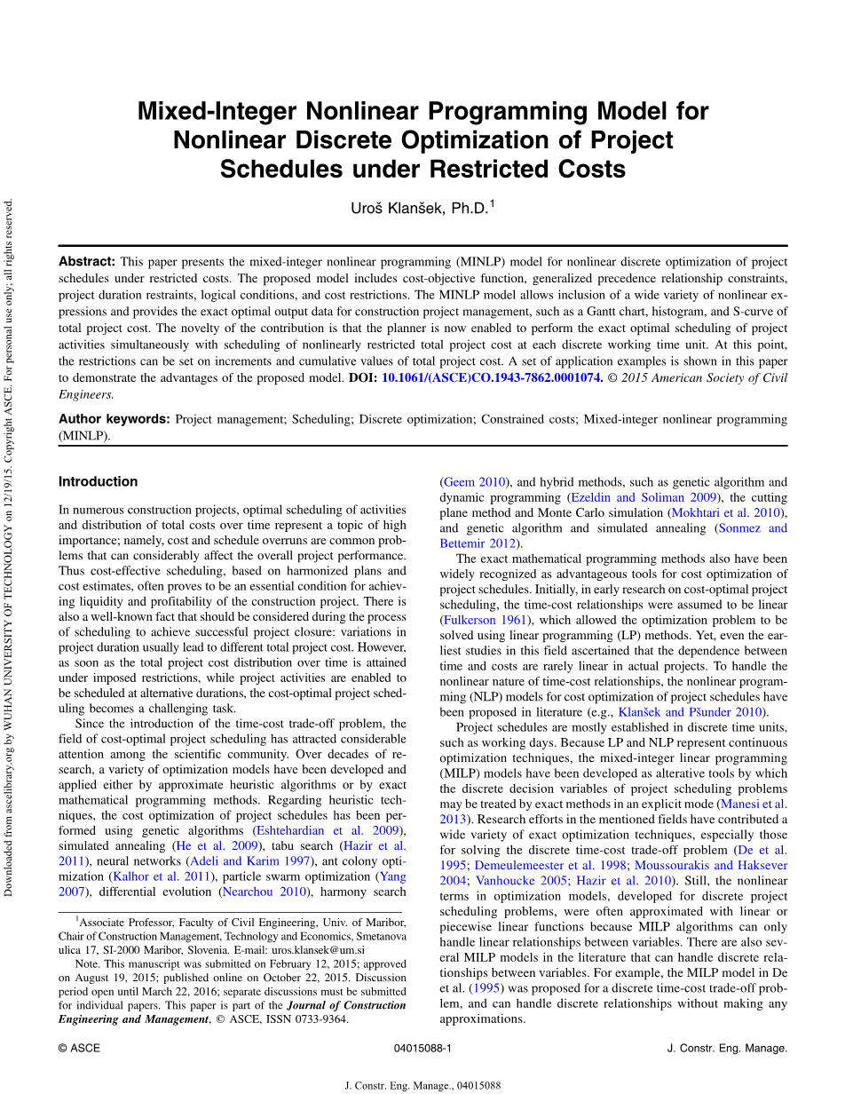 在Klanscaron;ekandPscaron;under(2012)的前一篇文章中,MINIP优化解决特定非线性离散项目调度问题的能力在时间成本折衷问题上得到了体现。在Klanscaron;ek(2014)的后续研究中,还针对一组参考问题,测试了不同的最新MINLP方法在组合,(非)凸和离散网络问题中的精确最优性能的表现。在获得的结果与文献的结果进行比较之后,两项研究都揭示了MINLP方法的解决方案效率。受到以往研究取得的成果的鼓舞,本研究的目的是在(非)线性限制成本的最优项目调度领域向前迈进,这是经常出现在施工管理实践中的具有挑战性的任务。将非线性依赖关系包含在项目调度过程中以及离散变量之间的自由度并同时处理以获得精确的最优解仍然是许多现有工具的重要障碍。
