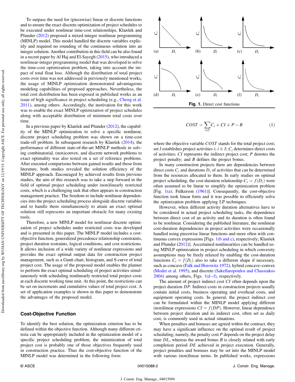 然而,当在实际项目调度任务中必须考虑不同的活动持续时间替代方案时,活动的直接成本与其持续时间之间的依赖性通常被认为是非线性的。 考虑到已发表的文献,项目活动中的非线性成本持续时间依赖性偶尔使用分段线性函数来处理,更常见的是具有连续凸表达式。 1(b和c); Klanscaron;ek和Pscaron;under(2012)]。 可以使用项目调度中的MINLP优化来处理确定的非线性,其中凸度假设可以通过使成本持续时间函数Cifrac14;feth;DiTHORN;在必要时采取不同的形状,如凹槽(FalkandHorowitz1972),混合凸轮(Moder等人) 1995)和离散(Sakellaropoulos和Chassiakos 2004)等。 1(d-f)