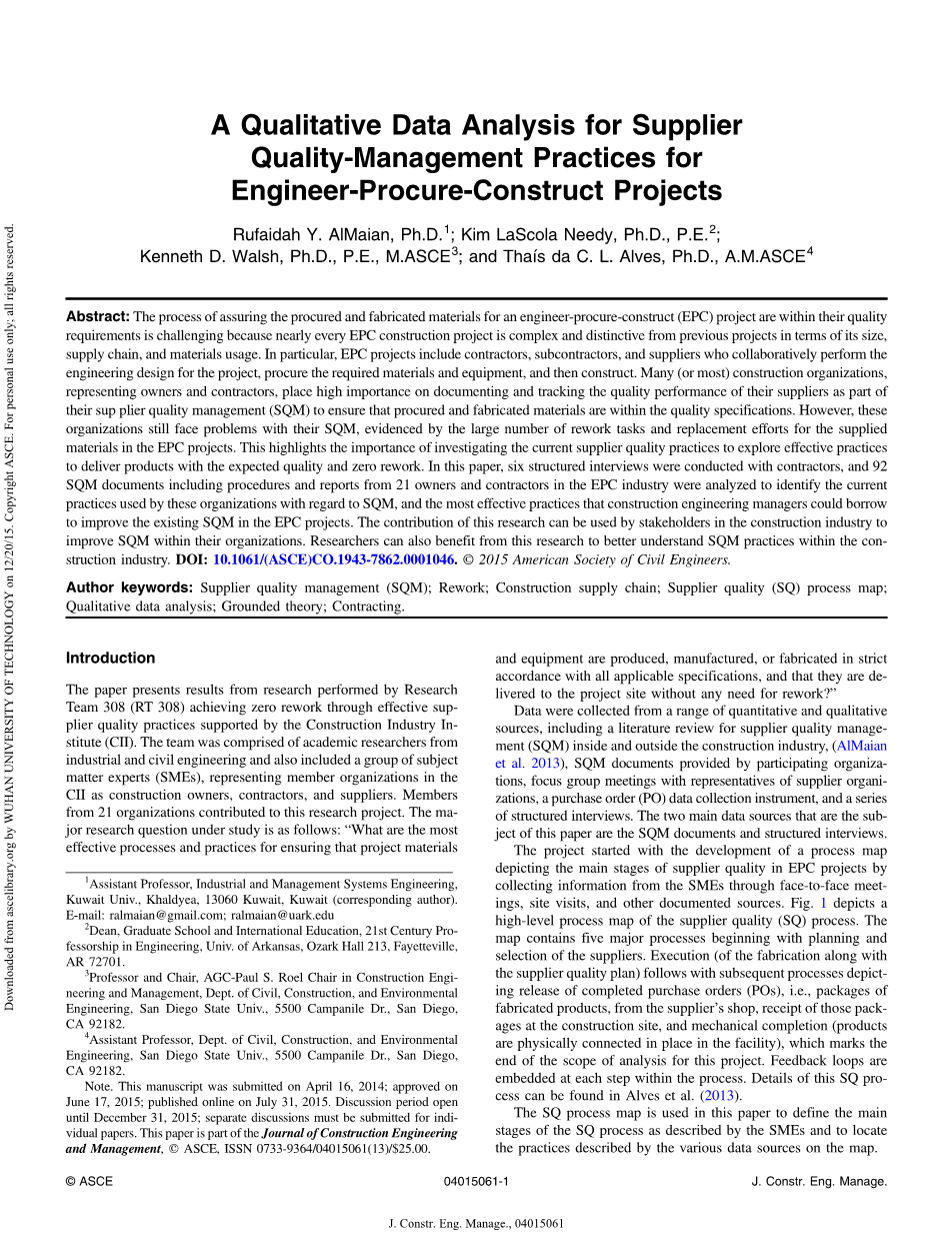 数据来自一系列数量和质量来源,包括建筑行业内外的供应商质量管理(SQM)文献综述(AlMaian et al。2013),参与组织提供的SQM文件,与供应商组织采购订单(PO)数据收集工具和一系列结构化访谈。 本文主题的两个主要数据来源是SQM文件和结构化访谈。