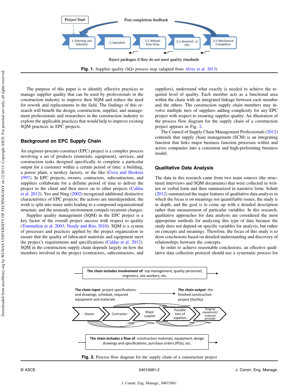 EPC项目中的供应商质量管理(SQM)是质量总体项目成功的关键因素(Tommelein等人2003; Needy and Ries 2010)。SQM是项目组织应用的过程和实践系统,以确保制造材料和设备的质量符合项目的要求和规格(Caldas等,2012)。建筑供应链中的质量管理主要取决于成员如何参与在项目(承包商,分包商和供应商)中,了解什么是实现所需的质量水平所需要的。每个成员充当链中的功能区域,每个成员与其他成员之间具有集成的连接。施工供应链成员可能会涉及多层供应商,为任何EPC项目增加复杂性,以确保供应商的质量。图中显示了施工项目供应链过程流程图2。