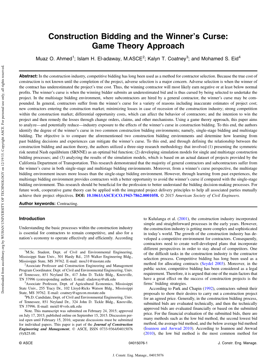 摘要:在建筑业中,竞争性投标一直被用作承包商选择的方法。由于在项目建成完成之前,建筑的真正成本是不知道的,所以逆向选择是一个主要的问题。不利的选择是合同获胜者低估了项目的真实成本。因此,获胜承包商很可能会获得负数或至少低于正常利润。获胜者的诅咒是当中标者提交低估的投标,因此被甄选进行项目诅咒。在总承包商招聘分包商的多级竞标环境中,赢家的诅咒可能会变得混乱。一般来说,承包商遭受胜利者的诅咒,原因有很多,包括对项目成本的不准确估计;新承包商进入建筑市场;尽量减少建筑行业经济衰退造成的损失;施工市场竞争激烈;差异机会成本,可能影响承包商的行为;并打算赢得项目,然后通过变更单,索赔等机制补救损失。采用博弈论,本文旨在分析并有可能降低行业暴露于获胜者诅咒在施工招标中的影响。为此,作者在两个共同的施工招标环境中确定了获胜者诅咒的程度;即单阶段招标和多级竞标。目的是比较上述两个施工招标环境,并确定如何从过去的投标决策和经验中学习如何减轻赢家的诅咒。为此,通过界定建筑投标和拍卖理论之间的关系,作者采用了三步研究方法:(1)将对称风险中性纳什均衡(SRNNE)作为最优投标函数; (2)开发单段和多级施工招标过程模拟模型;和(3)分析模拟模型的结果,该模型基于加利福尼亚交通部提供的项目的实际数据集。这项研究表明,大多数总承包商和分包商都遭受了单阶段和多阶段招标环境中赢家的诅咒。此外,从赢家的诅咒角度来看,多级竞标环境比单阶段招标环境带来更多的损失。然而,通过从过去的经验中学习,与单阶段招标环境相比,多级竞标环境为承包商提供了更好的机会避免获胜者的诅咒。这项研究应该有利于该行业更好地了解投标决策过程。对于未来的工作,合作博弈理论可以应用于综合项目交付原则,帮助所有相关方共同实现其项目目标。