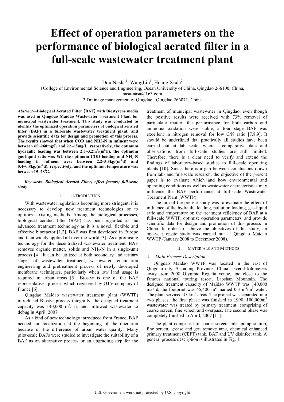 本研究的目的是评估水力负荷,污染负荷,气液比和温度对全尺寸污水处理厂BAF处理效率的影响,优化运行参数,为设计提供科学数据,并在中国推广这一进程。为了实现本研究的目标,在青岛麦岛污水处理厂(2008年1月至2008年12月)进行了为期一年的现场研究。