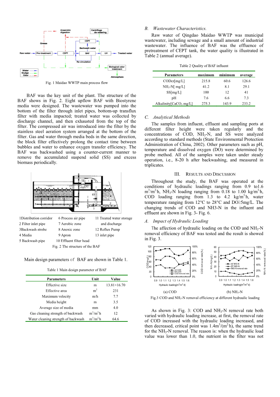 在整个研究中,BAF在水力负荷条件下运行,范围从0.9到1.6米3/ m2.h,NH3-N负荷范围从0.18到1.00 kg / m3.h,COD负荷范围为1.3至4.2kg/m3.h,水温范围为12°C至28°C,DOge;5mg/ L,进水和出水中COD和NH3-N的变化趋势如图3-图6所示。