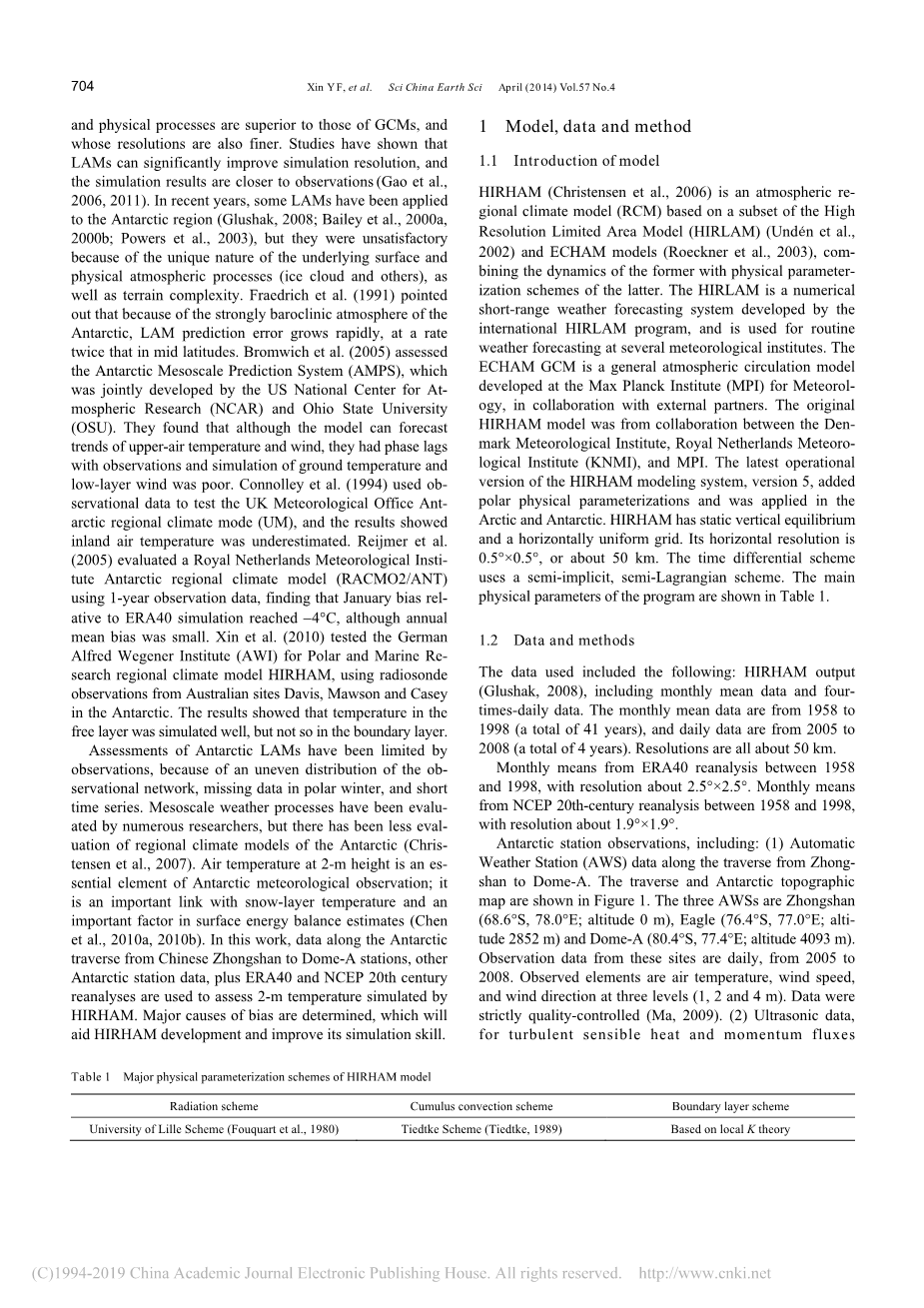 由于观测网络分布不均、极地冬季数据缺失、时间序列短,对南极LAMs的评估受到观测资料的限制。中尺度天气过程已经被许多研究人员评估过,但对南极区域气候模型的评估较少(Christensen等,2007)。2米高的气温是南极气象观测的重要要素;它是雪层温度的重要环节,也是地表能量平衡估算的重要因素(Chen et al., 2010a, 2010b)。本文利用中国中山至天穹a站的南极横贯数据,以及其他南极站数据,加上ERA40和NCEP 20世纪再分析,对HIRHAM模拟的2 m温度进行了评估。确定了产生偏差的主要原因,这将有助于HIRHAM的开发和仿真技术的提高。