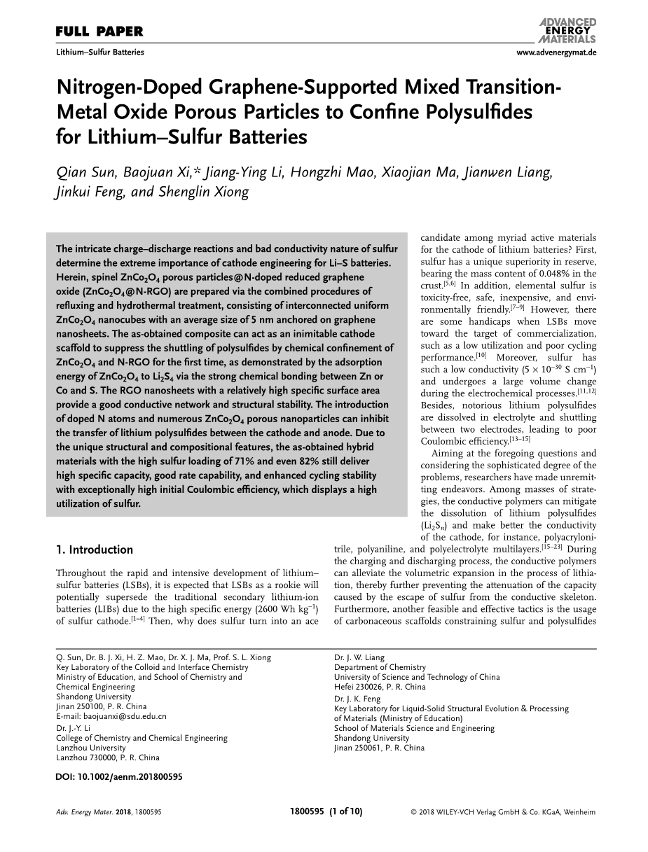 由于硫的复杂充放电反应和不良导电性所以决定了阴极材料对Li-S电池的重要性。在本文中,通过回流和水热处理的组合工艺制备尖晶石ZnCo2O4 多孔颗粒@N掺杂还原氧化石墨烯(ZnCo2O4@N-RGO),其由相互连接的均匀组成。平均尺寸为5nm的ZnCo2O4 纳米立方体锚定在石墨烯纳米片上。所获得的复合材料可以作为无法模拟的阴极材料,通过Zn或Co与S之间的强化学键合,通过ZnCo2O4 和N-RGO的化学作用可以形成抑制多硫化物穿梭的支架,ZnCo2O4对Li2S的吸附量证明了这一点。具有相对高比表面积的RGO纳米片提供良好的导电网络和结构稳定性。掺杂的N原子和许多ZnCo2O4多孔纳米颗粒的引入可以抑制阴极和阳极之间的多硫化锂的转移。由于具有独特的结构和组成特征,所获得的混合材料具有71%甚至82%的高硫负荷仍然可以提供高比容量,良好的倍率性能和增强的循环稳定性,具有极高的初始库仑效率,显示出较高的硫利用率。