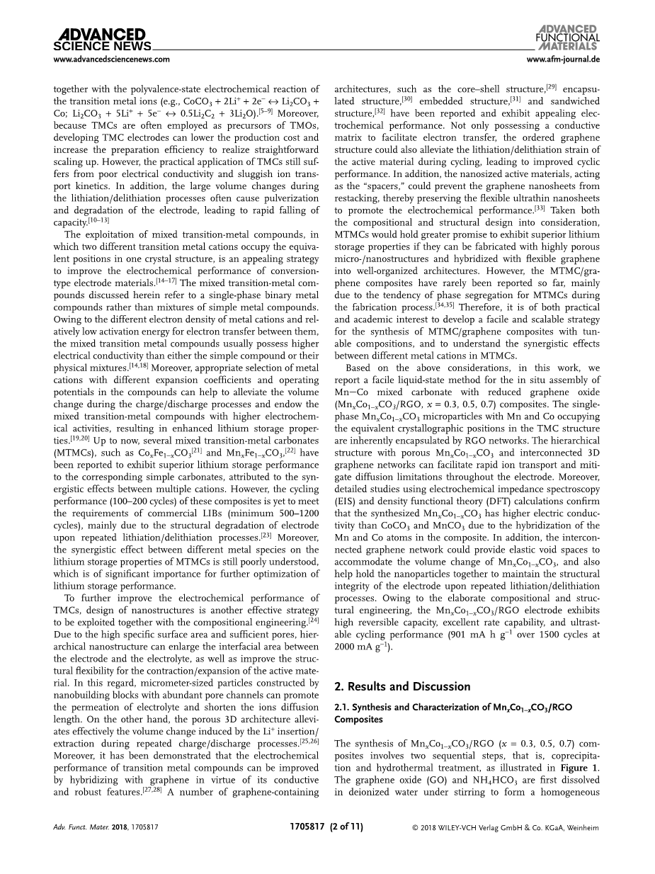 开发混合过渡金属化合物,其中两种不同的过渡金属阳离子占据一个晶体结构中的等效位置,改善转换型电极材料电化学性能的一种有吸引力的策略。[7,10]混合过渡金属化合物本文讨论的是指单相二元金属化合物而不是简单金属化合物的混合物。由于金属阳离子的电子密度不同以及它们之间电子转移的活化能相对较低,混合过渡金属化合物通常具有比简单化合物或其物理混合物更高的电导率F50) 此外,适当选择金属阳离子在化合物中具有不同的膨胀系数和操作电位有助于减轻充电/放电过程中的体积变化,并赋予混合的过渡金属化合物更高的电化学活性,从而提高锂储存性能。[19,20]到目前为止,据报道,几种混合过渡金属碳酸盐(MTMCs),如CoxFe1-xCO3 [21]和MnxFe1-xCO3,[22]具有优异的锂储存性能相应的简单碳酸盐,归因于多种阳离子之间的协同效应。然而,这些复合材料的循环性能(100-200个循环)尚未满足商业LIB(最少500-1200个循环)的要求,主要是由于在重复锂化/脱锂过程中电极的结构降解[23]此外,不同金属种类对MTMCs锂储存性能的协同作用仍然知之甚少,这对进一步优化锂储存性能具有重要意义。进一步提高电化学性能,TMCs,纳米结构的设计是另一种与组成工程一起开发的有效策略。[24]由于高比表面积和足够的孔隙,分层纳米结构可以扩大电极和电解质之间的界面面积,并改善活性材料收缩/膨胀的结构灵活性。在这方面,通过具有丰富孔通道的纳米结构嵌段构建的微米级颗粒可以促进电解质的渗透并缩短离子扩散长度。另一方面,多孔3D结构有效地缓解了在重复充电/放电过程中由LF63) 插入/提取引起的体积变化。[25,26]此外,已经证明过渡金属化合物的电化学性能可以是通过与石墨烯杂交而得到改善,具有导电性和强大的特性) 含有多种石墨烯已经报道了诸如核 - 壳结构,[29] 封装结构嵌入结构,[30]和夹层结的结构,并且表现出吸引人的电化学性能。不仅具有促进电子转移的导电基质,有序石墨烯结构还可以在循环期间减轻活性材料的锂化/脱锂应变,从而改善循环性能。此外,作为“间隔物”的纳米级活性材料可以防止石墨烯纳米片重新堆叠,从而保留柔性超薄纳米片以促进电化学性能。[31]考虑到组成和结构设计,MTMCs将如果它们可以用高度多孔的微/纳米结构制造并与柔性石墨烯混合成组织良好的结构,那么它们有望展现出卓越的锂储存性能。然而,到目前为止,MTMC /石墨烯复合材料很少被报道,主要是由于制造过程中MTMC的相分离倾向因此,开发一种简便易用的可扩展策略既具有实际意义,也具有学术兴趣。合成具有可调成分的MTMC /石墨烯复合材料,并了解MTMC中不同金属阳离子之间的协同效应。