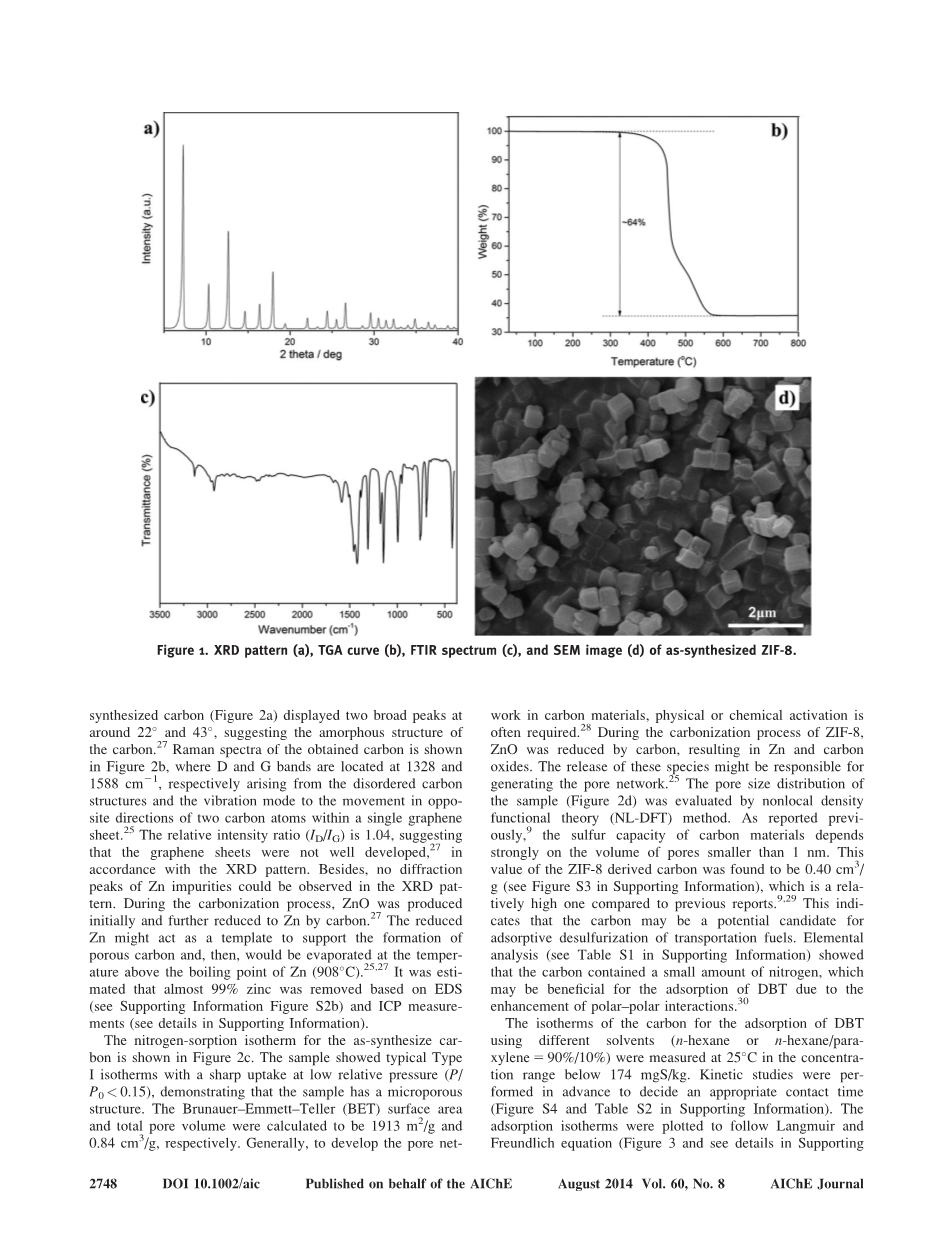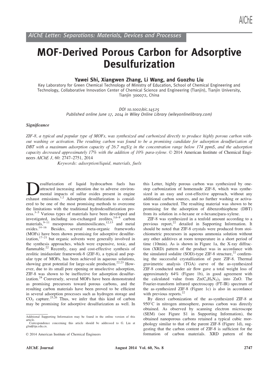 由于发动机废气排放中存在的硫氧化物的不利环境影响,液体烃燃料的脱硫受到越来越多的关注。吸附脱硫被认为是克服传统加氢脱硫工艺局限性的最有希望的方法之一。已经开发和研究了各种类型的材料,包括离子交换沸石,碳碳材料,介孔硅铝酸盐,和金属氧化物。此外,几种元有机骨架(MOFs)已被证明有希望吸附脱硫,但有机溶剂通常参与合成方法,这是昂贵的,有毒的和易燃。最近,在水溶液中已经实现了一种典型和普遍类型的MOF的沸石咪唑盐框架(ZIF-8)的合成和成本有效的合成,显示出大规模生产的巨大潜力。然而,由于其小孔开放或非选择性吸附,ZIF-8显示对吸附脱硫无效。相反,已经证明了几种MOF作为有前途的多孔碳前体,所得到的碳材料已经被证明在几种吸附过程如氢气储存和二氧化碳捕集中都是有效的。因此,我们推断这种碳对于吸附脱硫也是有希望的。在这封信中,高度多孔的碳是通过自制的ZIF-8的自发碳化合成的,该化合物是以简单和成本有效的方法合成的,没有任何额外的碳源,并且不进行进一步的洗涤或活化。 显示所得材料对于从其在正己烷或正己烷/对二甲苯中的溶液吸附二苯并噻吩(DBT)是有希望的。