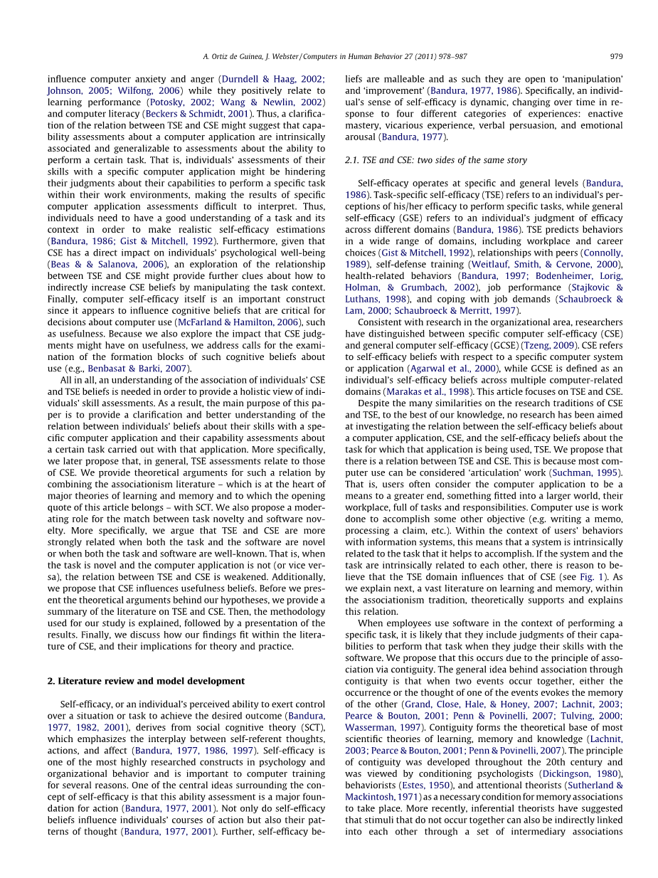 总而言之,需要了解个人的CSE和TSE信念的关联,以便提供个人的技能评估的整体观点。因此,本文的主要目的是提供一个澄清和更好地了解个人的信念与他们的技能和一个特定的计算机应用程序之间的关系,以及他们对用应用程序执行的某个任务的能力评估。更具体地,我们之后建议,一般来说,TSE评估与CSE的评估有关。我们通过将联想心理学文学与SCT结合起来,为这种关系提供理论论证,这些文献是学习和记忆的主要理论核心,本文开头所述。我们还提出了任务新颖性和软件新颖性之间的匹配的调节作用。更具体地,我们认为,当任务和软件是新颖的或当任务和软件是众所周知的时,TSE和CSE更强烈相关。也就是说,当任务是新颖的并且计算机应用不是(或反之亦然)时,TSE和CSE之间的关系被削弱。此外,我们认为CSE影响有用的信念。在我们提出我们的假设背后的理论论据之前,我们提供关于TSE和CSE的文献的概述。然后,解释用于我们的研究的方法,随后介绍结果。最后,我们讨论我们的研究结果如何适应CSE的文献,以及它们对理论和实践的影响。